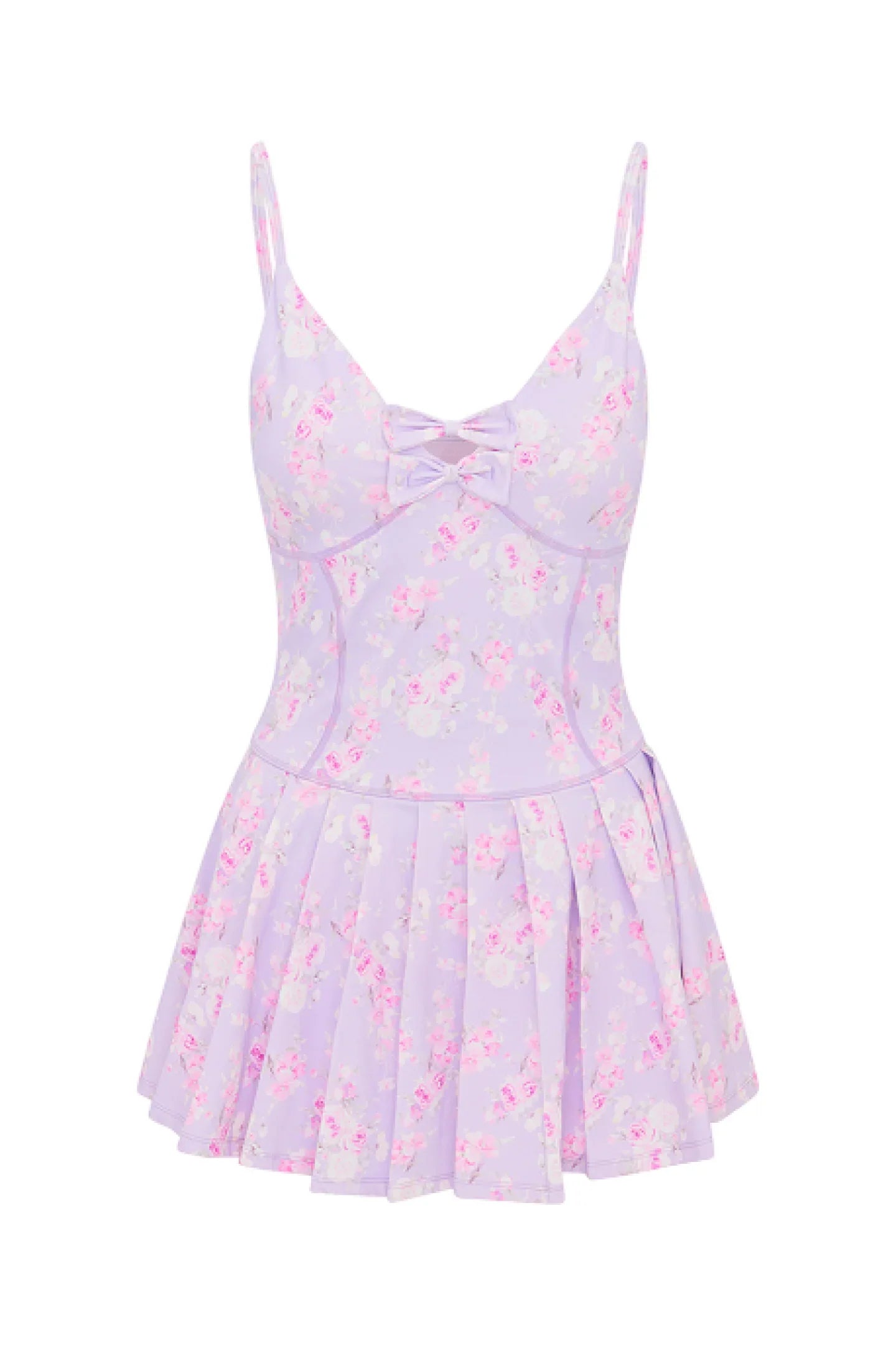 Game, set, mini. The Hubert Dress returns in our signature floral prints. Designed with a lightweight, breathable fabric, this active dress features built-in shorts for functionality, bra cups at the bust, functional pockets, princess and a center front seam. This sporty mini has thin spaghetti straps, a bow detail at center front, and an airy ruffle skirt.