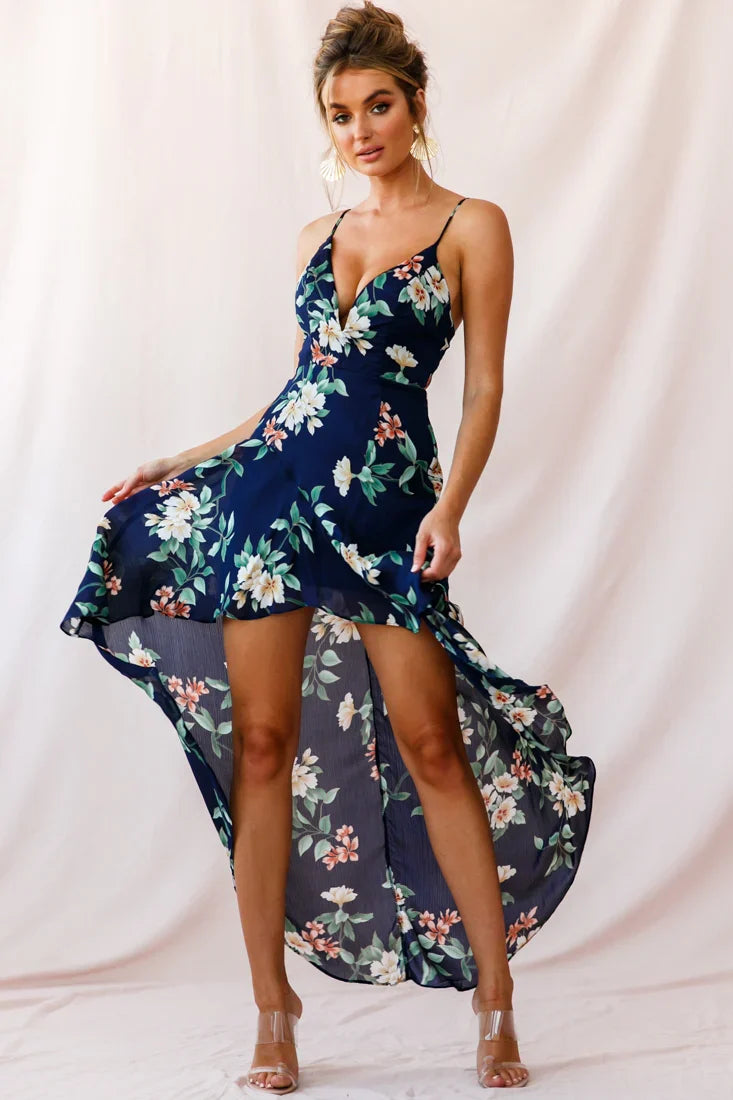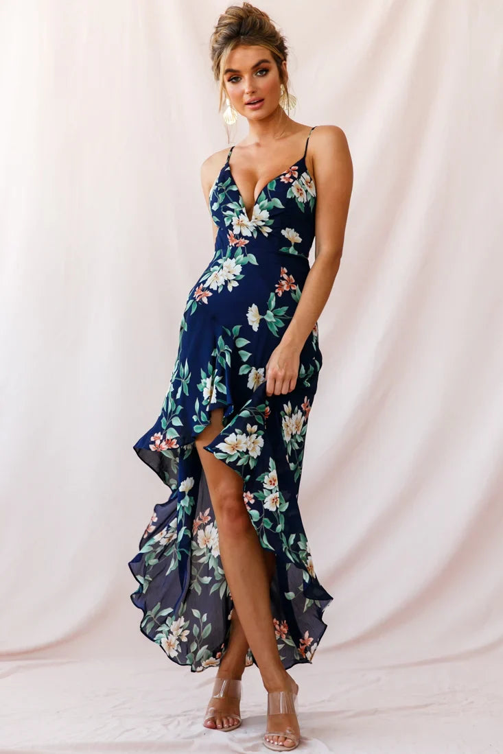 Look like a princess in our stunning Imelda dress! Perfect for cocktails with your girls at a classy rooftop bar or an extravagant daytime event. Featuring a plunging V-neckline, high-low hem, adjustable cami straps and the most gorgeous, soft, floral print fabric. Team it with gold hoop earrings, tousled locks and a clutch for an elegant look we are loving.