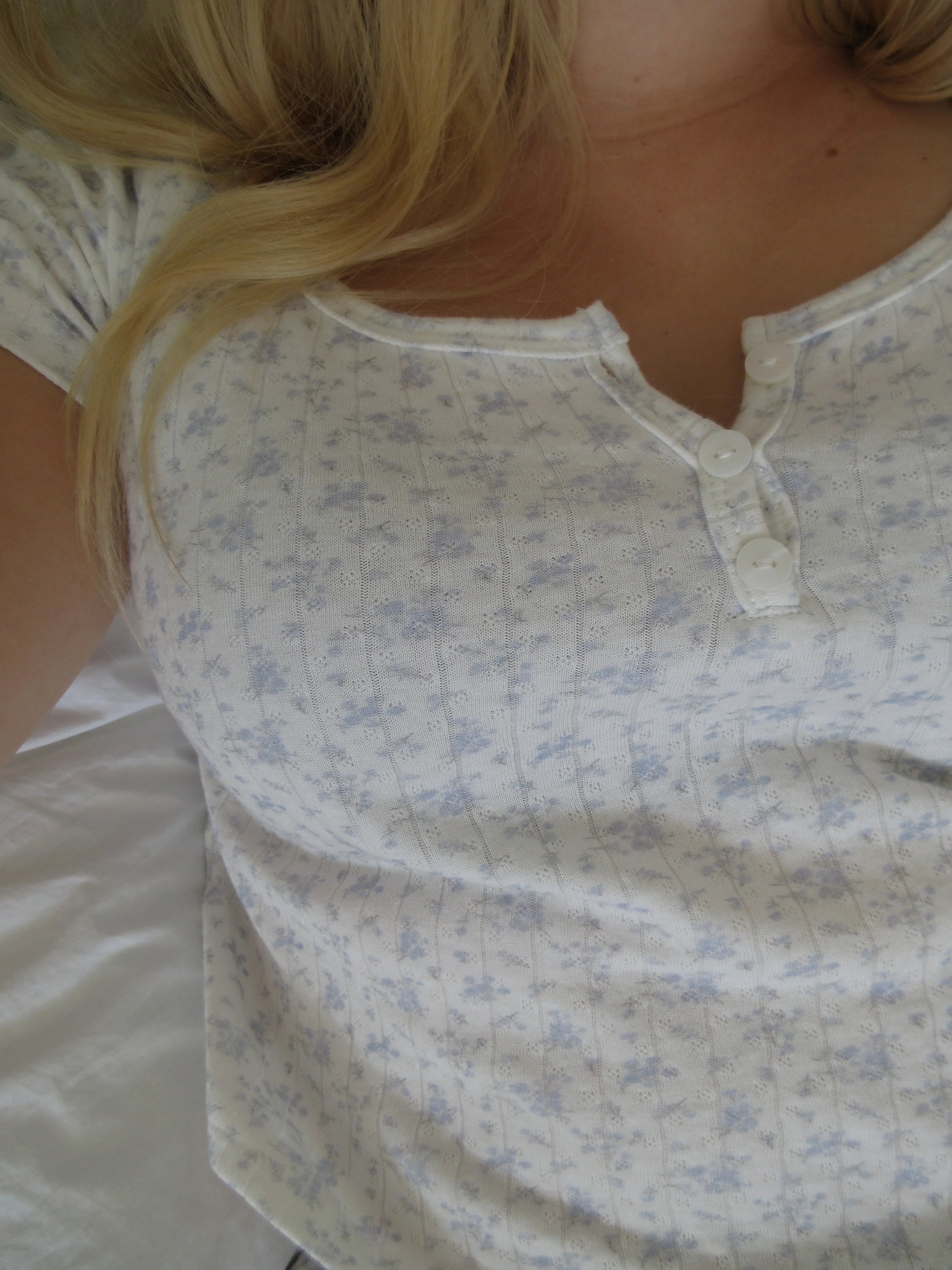 Fitted white short sleeve top, entirely detailed with blue floral bouquets. This top includes a scoop neck with three buttons detailing.