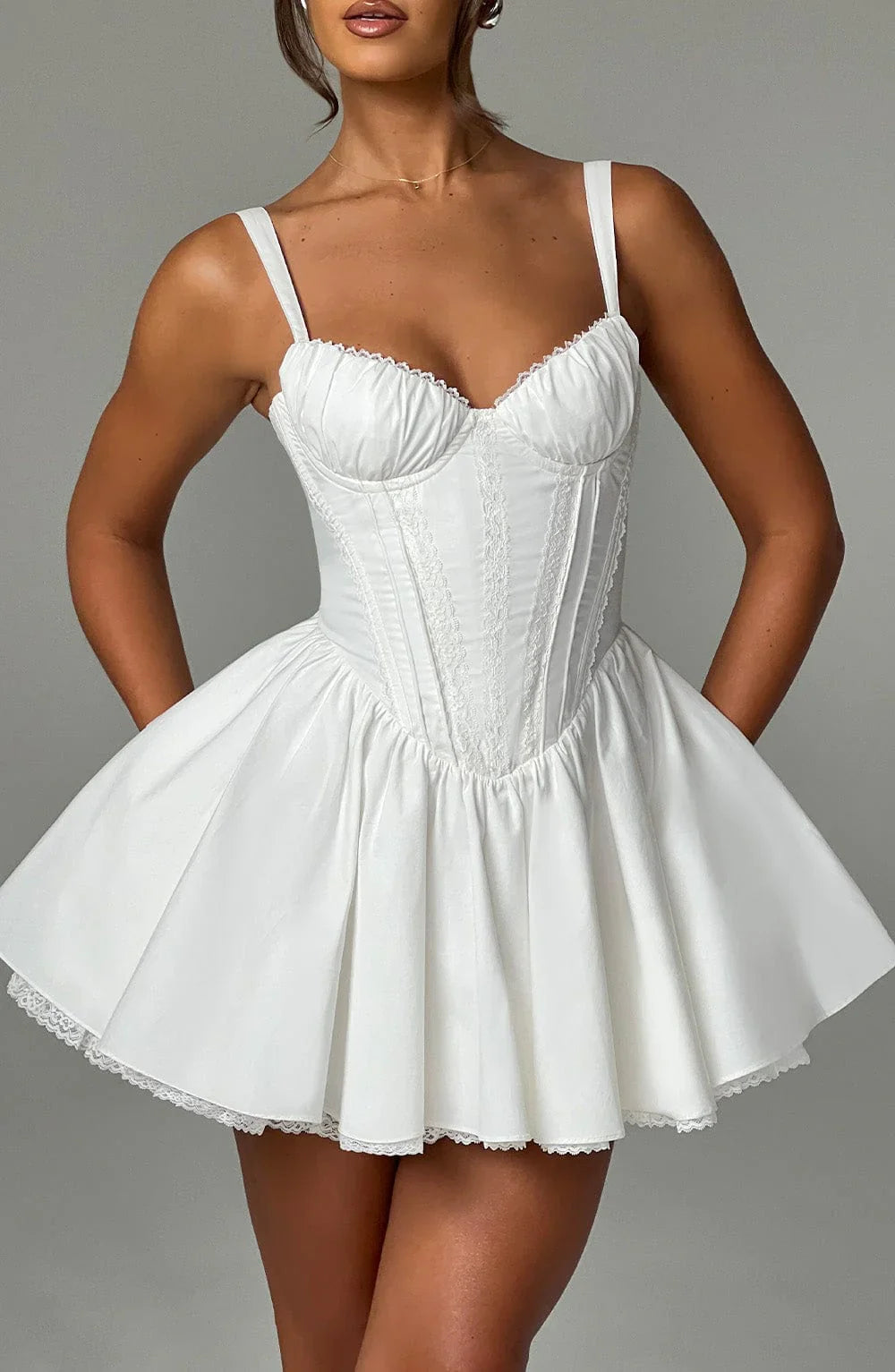 The perfect dress for date nights with the prettiest silhouette, Josie is cut from our premium cotton blend with flirty lace trims to the bust and skirt. With an oversized bow to the back, this flirty design has a boned bodice for the ultimate snatched waist, which is a pretty contrast to the super full skirt.