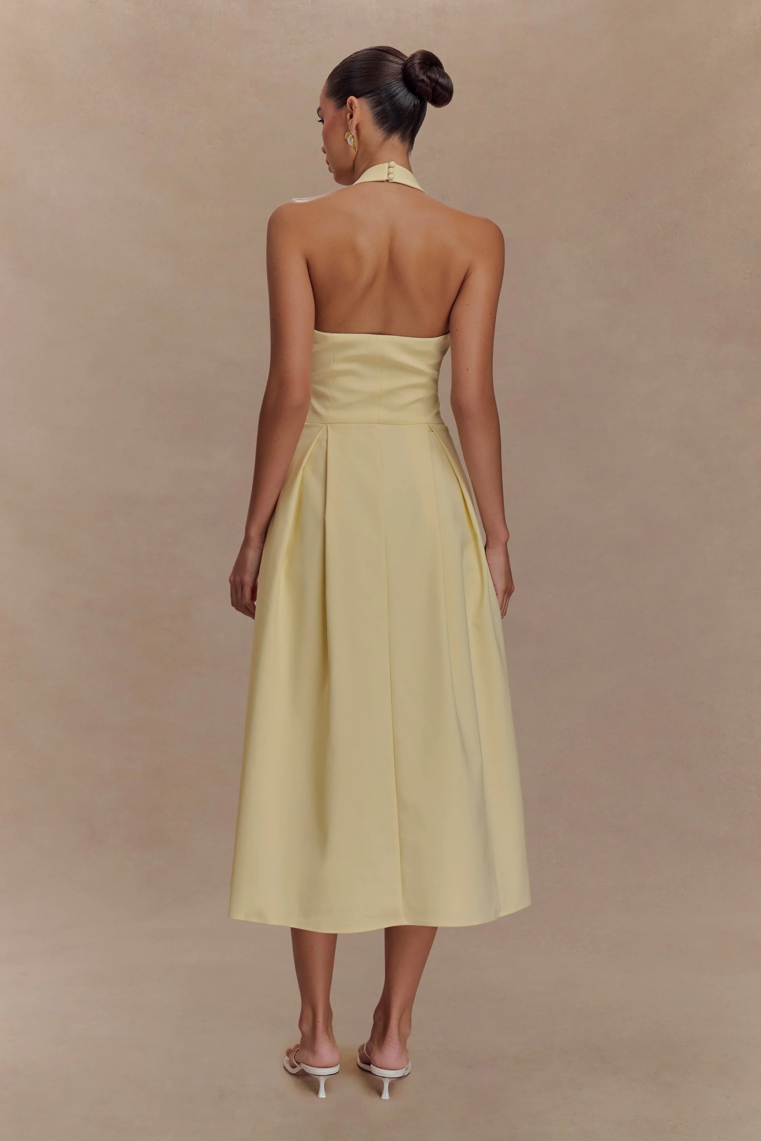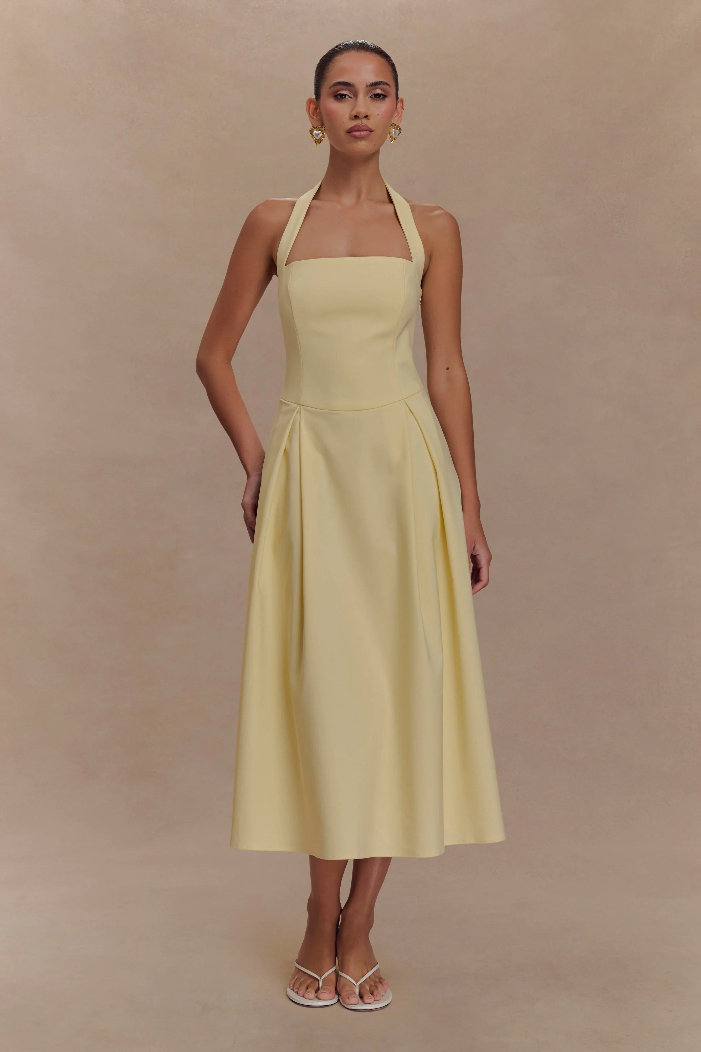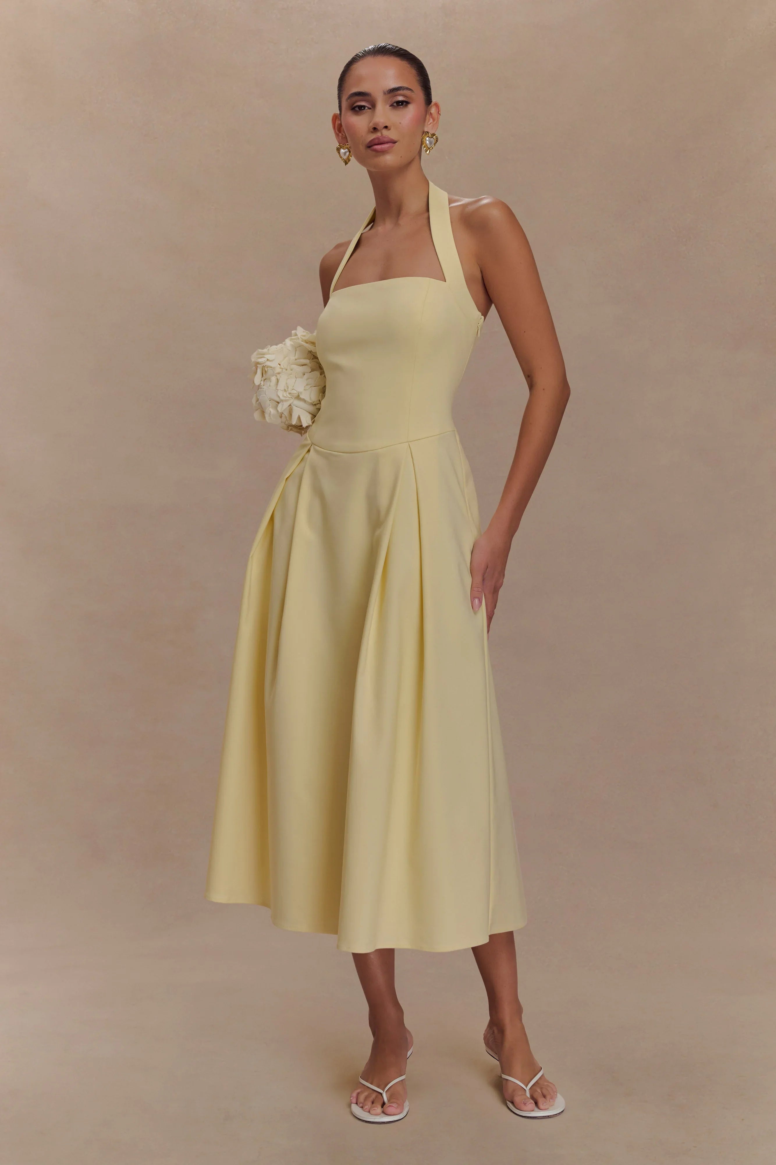 Step into timeless sophistication with the JUANA Halter Midi Dress, a graceful design that exudes femininity. Featuring a flattering halter neckline and a rounded waistline, this dress beautifully highlights your silhouette. The front and back skirt pleats add movement and texture, enhancing its refined charm. Designed in a chic midi length with a discreet side zip for easy wear, this dress is perfect for weddings, soirées, or any occasion where effortless elegance is key.