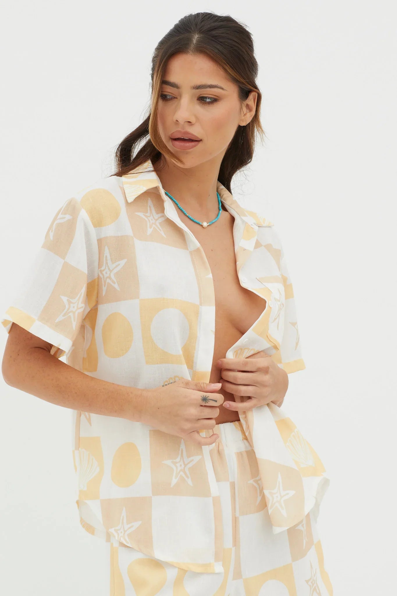 Hey there, cutie! We are loving the print on our Just A Hunch shirt. Perfect for weekend brunch dates with your besties, it looks super cute paired with its matching shorts or wear it with a denim mini and mules for a look we are loving.