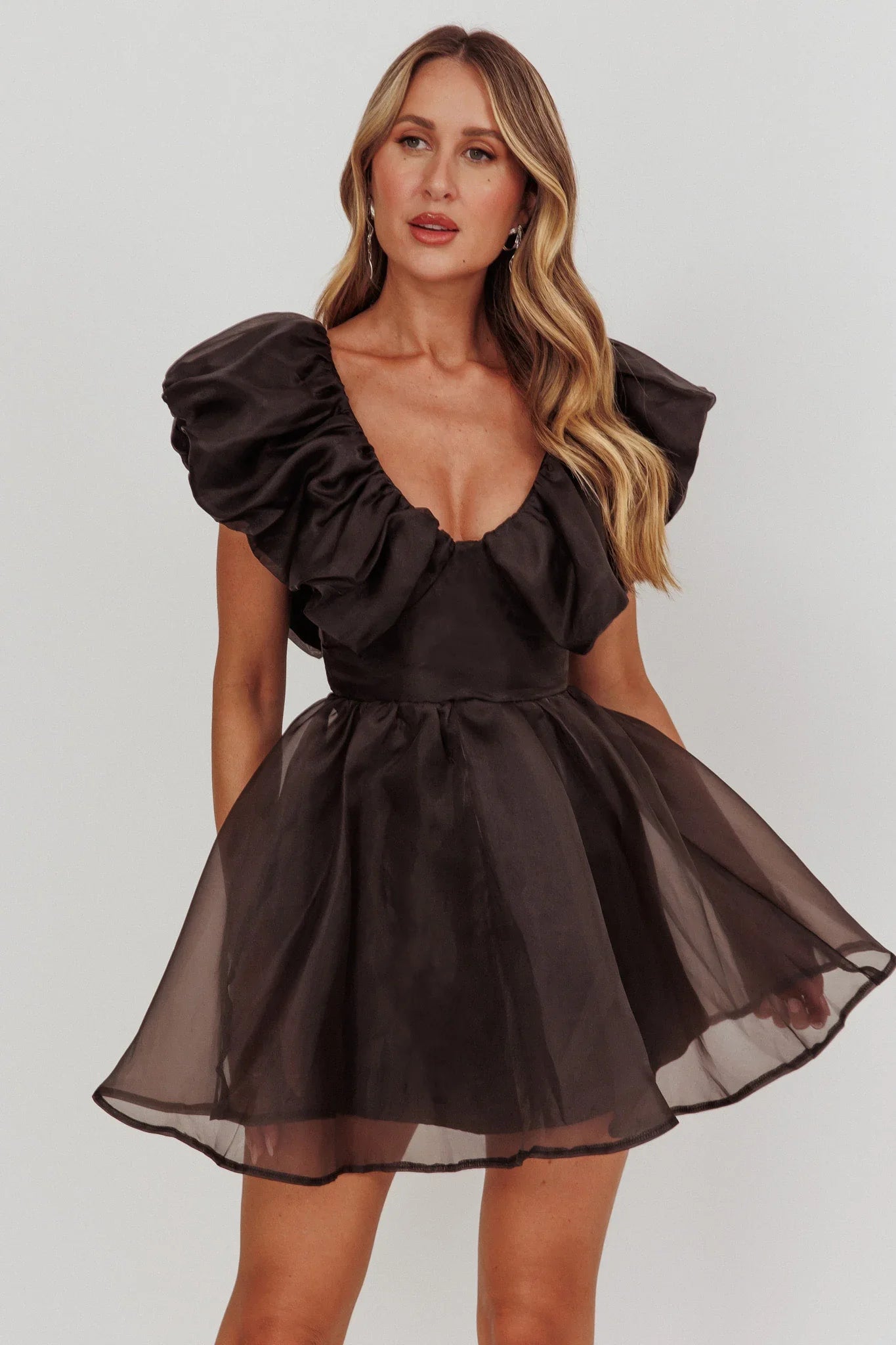 Make a statement in our gorgeous Kahlo mini dress. It features a bold, ruffle neckline and is perfect for a special birthday celebration or holiday party. Team it with black, strappy heels and a mini purse for a look that will turn heads.