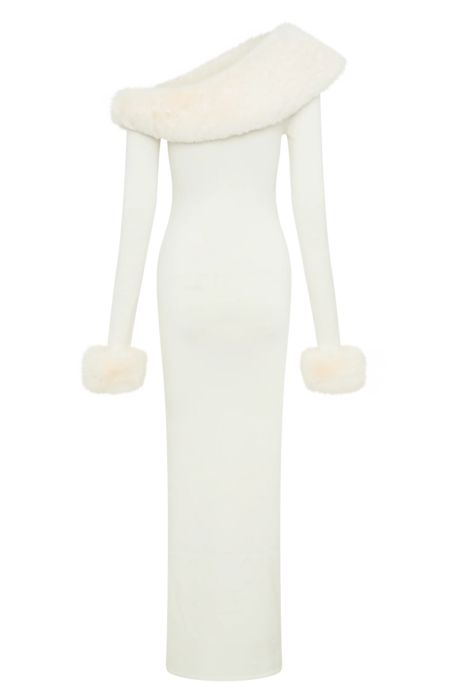The KARLEIGH Faux Fur Knit Maxi Dress is a luxurious blend of cosy elegance and contemporary style. Featuring a striking asymmetrical neckline and crafted from soft knit fabrication, this dress offers a figure-hugging bodycon fit that’s both flattering and comfortable. The long sleeves are enhanced with plush faux fur cuffs, while the fur neckline adds an extra touch of warmth and sophistication. With its maxi length and sleek silhouette, this dress is the perfect choice for a chic evening out or any event where you want to stand out in style.