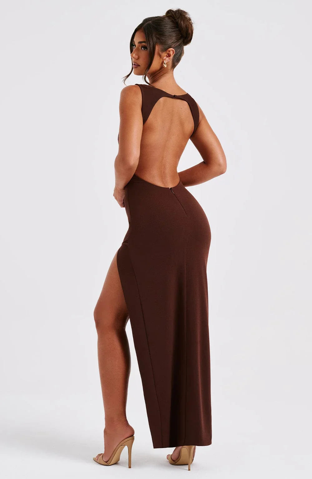 Kassandra is our timeless, chic maxi, cut with a boat neck that fastens to the back neck with a button. This maxi is made from our luxury stretch crepe with a thigh high shaped split and low scoop back.