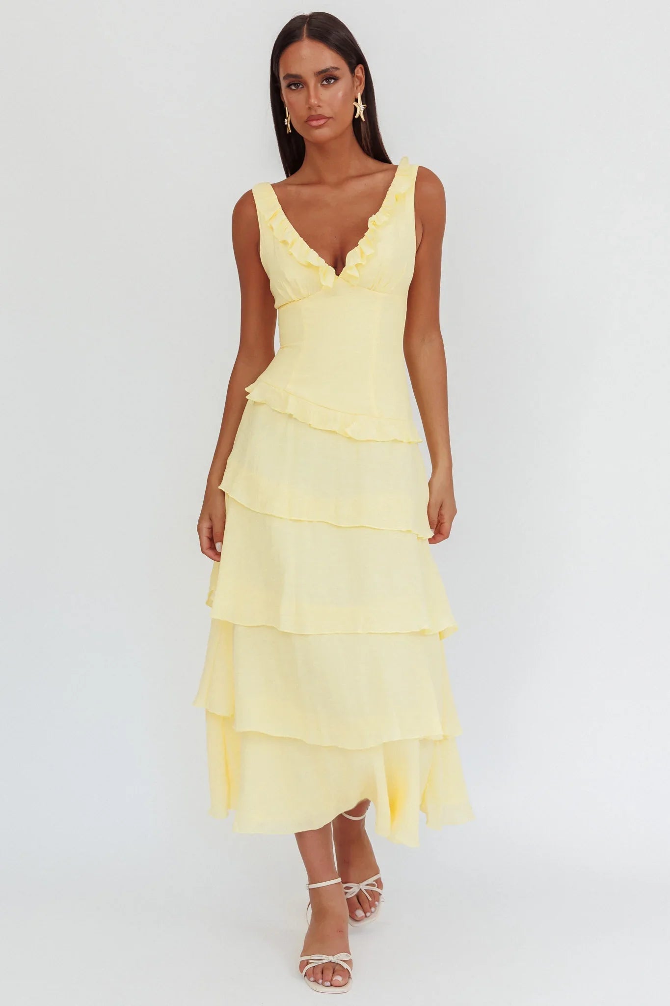 Turn heads in our stunning Khlara maxi dress. We are loving its frill trim detail and Summery hue. Perfect for a birthday dinner or wedding. Team it with strappy, nude heels and a clutch for an unforgettable look.