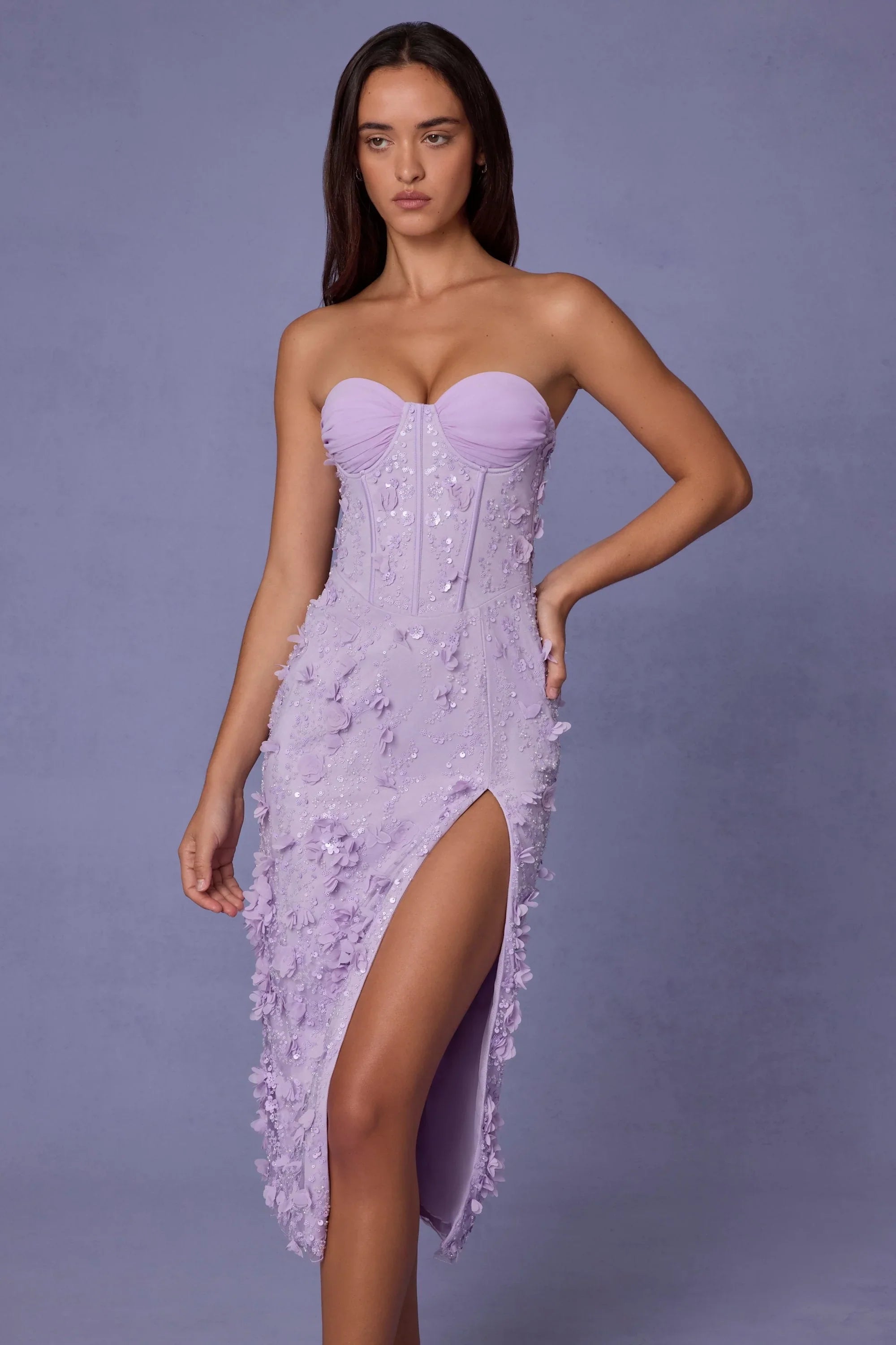 Turn heads from sunset to sunrise with Eudora. Adorned with floral appliqués and sequin embellishments over our premium tulle fabric, it’s framed with a corset silhouette that hugs and sculpts your figure. The A-line skirt is punctuated with a thigh-high front split that adds an element of allure.