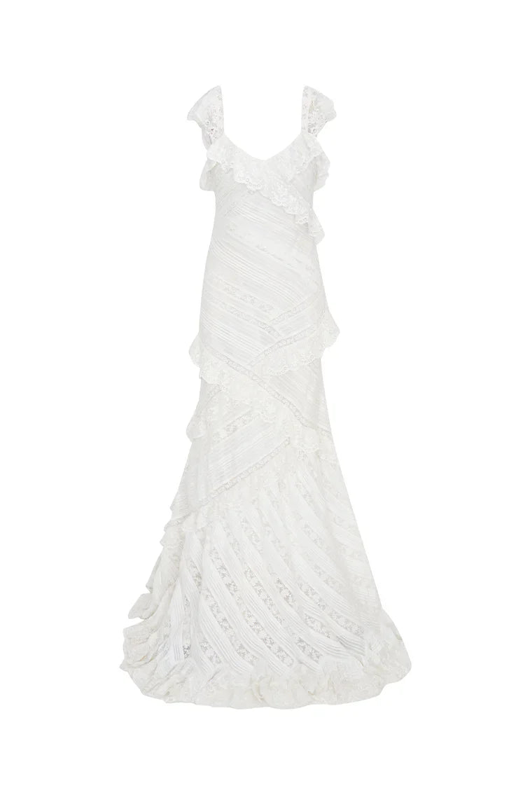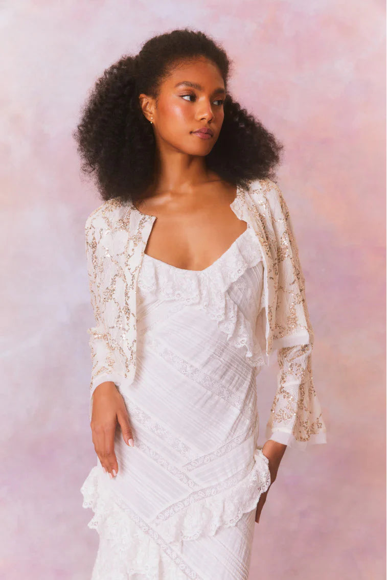 The Lalika Dress debuts with a crisp cotton fabric, easy and chic for the warm weather season. This sunshine maxi dress features short flutter sleeves with lace detail all over with asymmetrical ruffles all over. The dress falls to a sweeping skirt with threaded wrap scalloping at the hem for a stunning finish