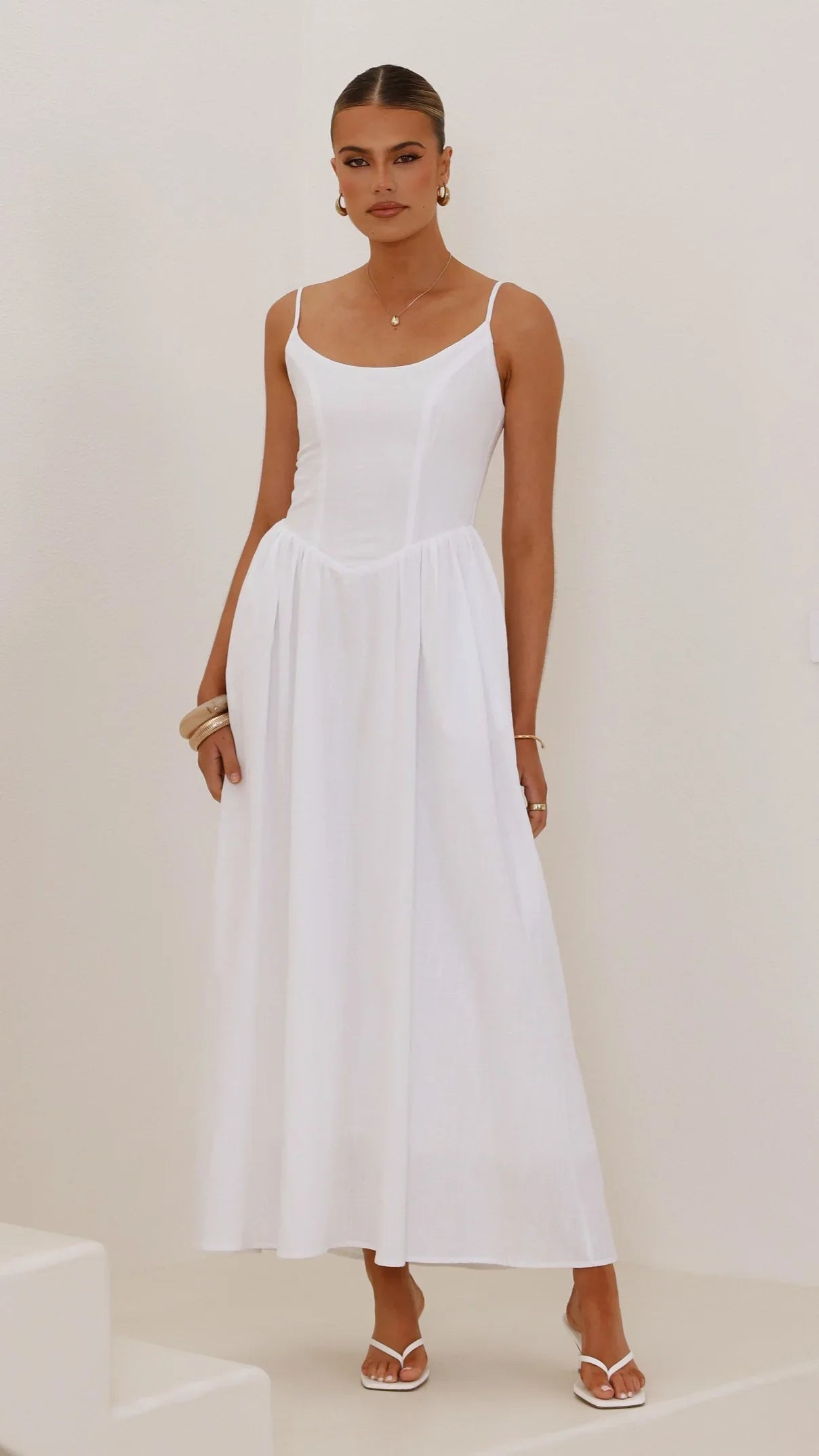 Experience effortless elegance with the Laurelia Maxi Dress in white. This floor-length dress features delicate, adjustable thin straps and a flattering scooped neckline. The soft bodice is complemented by a shirred back panel and a hidden back zipper for a perfect fit. Practical side pockets add convenience, while the fully lined cotton fabric ensures comfort and breathability throughout the day.