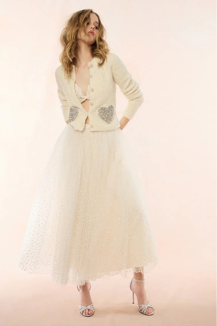 Loving on the Leocadia Cardigan. This gorgeous knit is designed from a warm, wool boucle blend giving it an extra cozy look and feel. The pretty cardigan features crystal-embellished heart-shaped pockets at the front for a playful touch as well as pearl-and-crystal novelty buttons down center front. Pair with a Ruffle Mini Skirt or your favorite pair of vintage denim.
