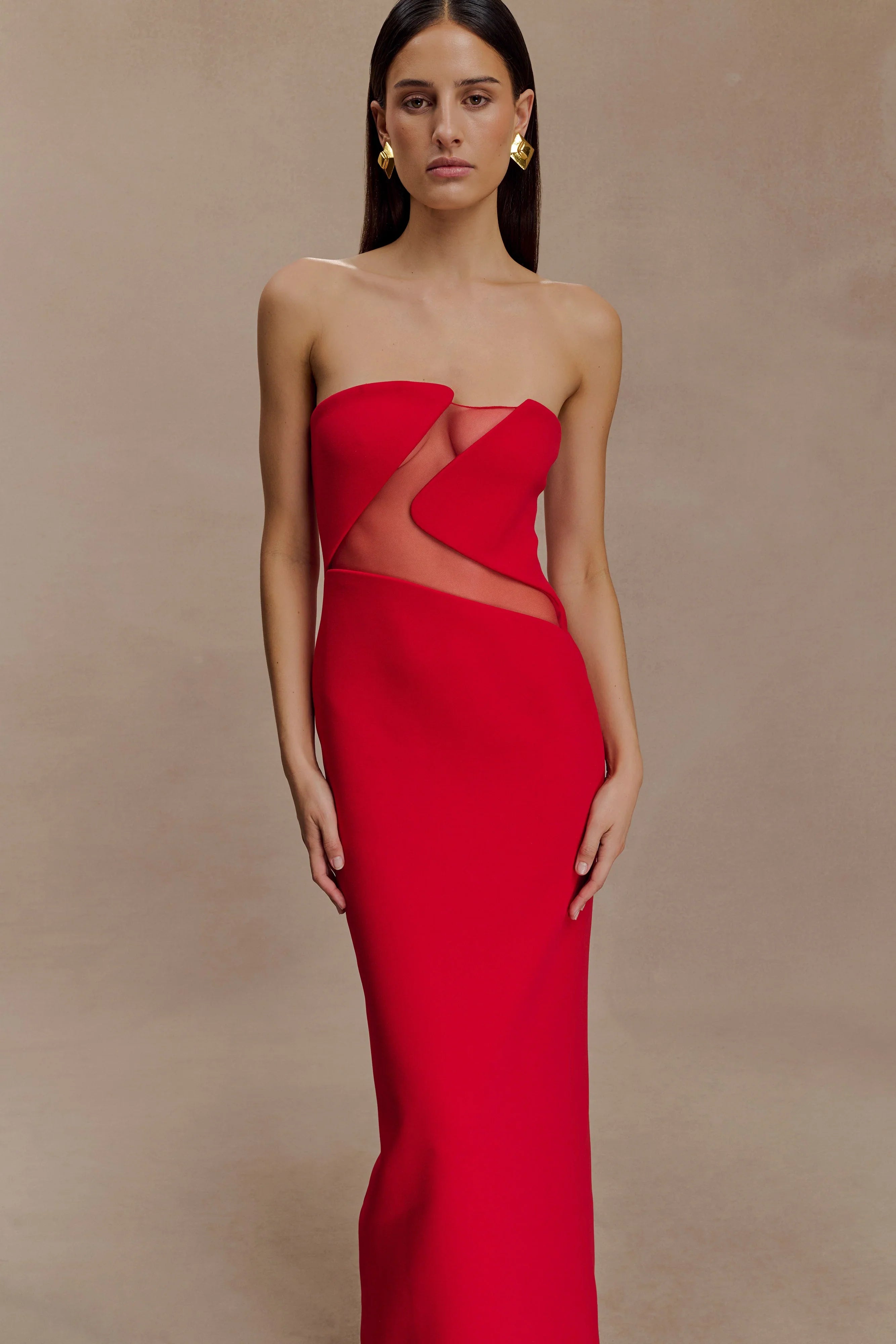 The LIANNE Strapless Maxi Dress is a modern take on classic elegance. Designed with a clean strapless neckline and a sculpted bodice, it’s detailed with a sheer mesh cut-out at the front for an unexpected touch of allure. Falling into a floor-grazing hem, this dress creates a lengthened silhouette while maintaining a streamlined fit. Partially lined and finished with an invisible back zip, this dress is refined, confident, and designed to make a statement after dark.