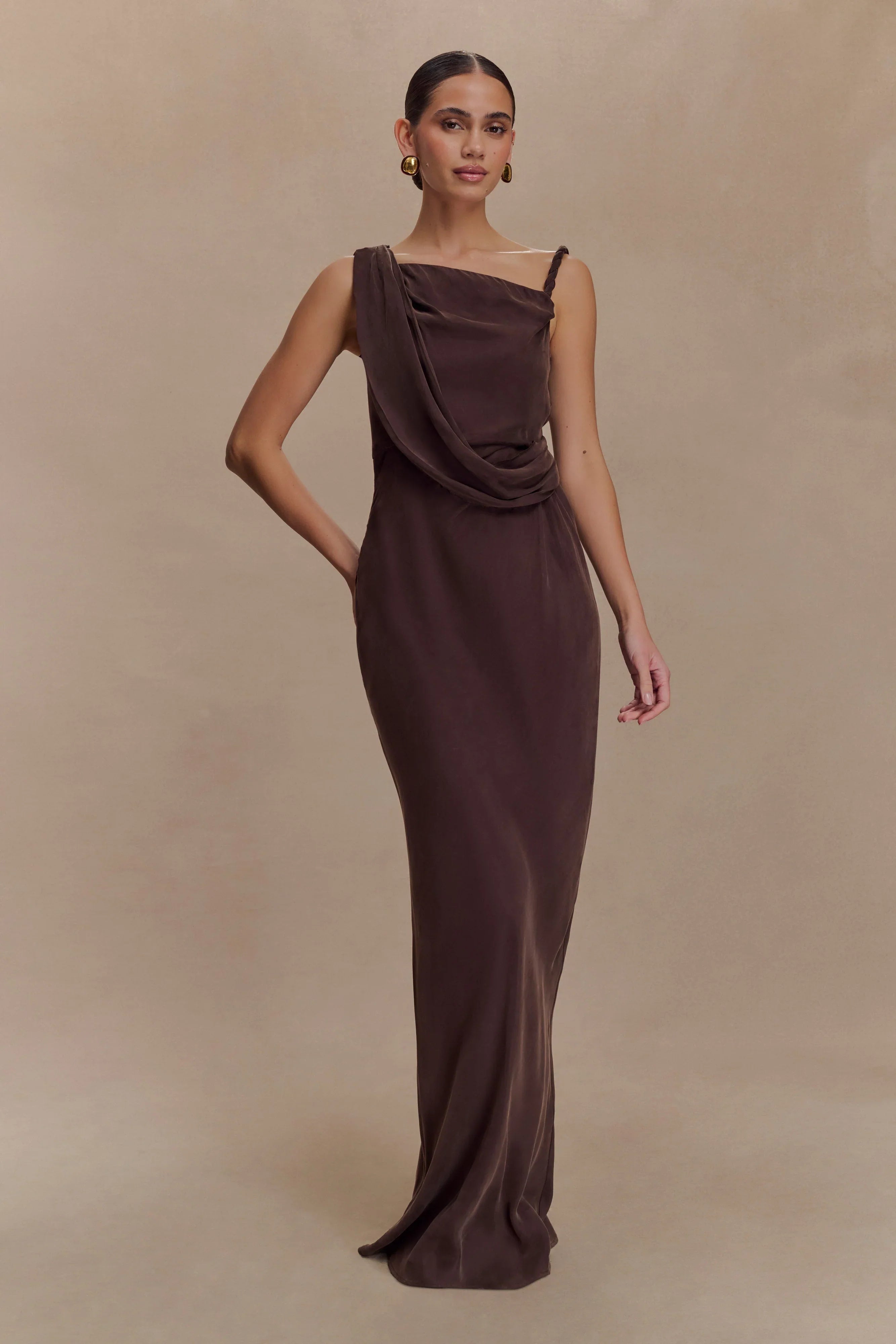The LORIEANNE Draped Maxi Dress is a fluid take on evening elegance. Designed with an asymmetric neckline and a twisted single strap, this silhouette is elevated by artfully draped fabric that flows across the front and back. A subtle invisible zip maintains a clean, seamless finish, while the maxi length adds a sense of refined drama. Perfect for events where understated impact makes the loudest statement.