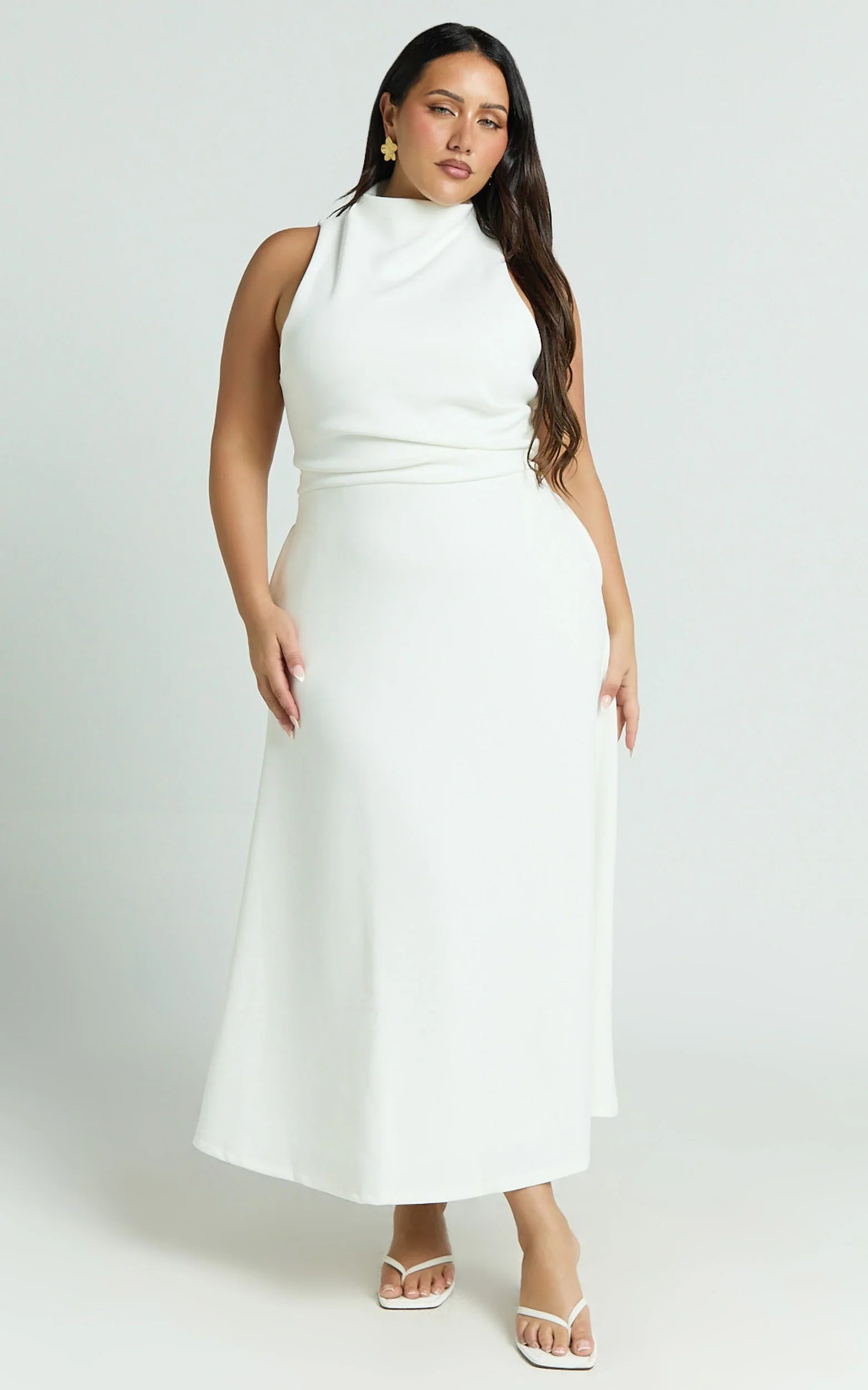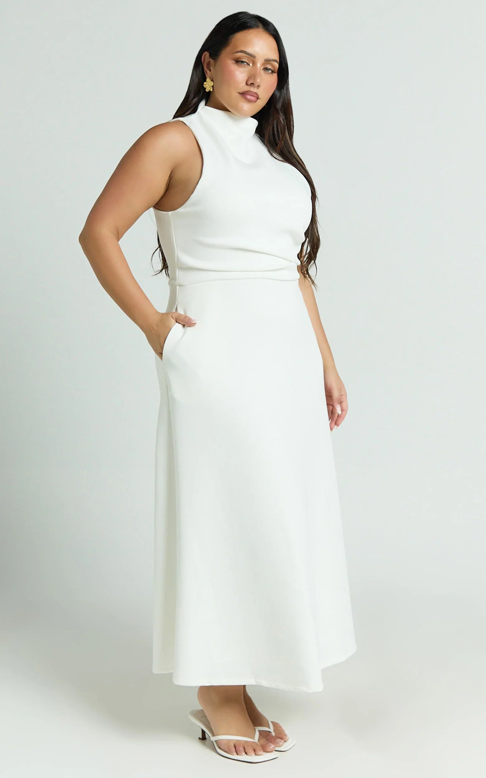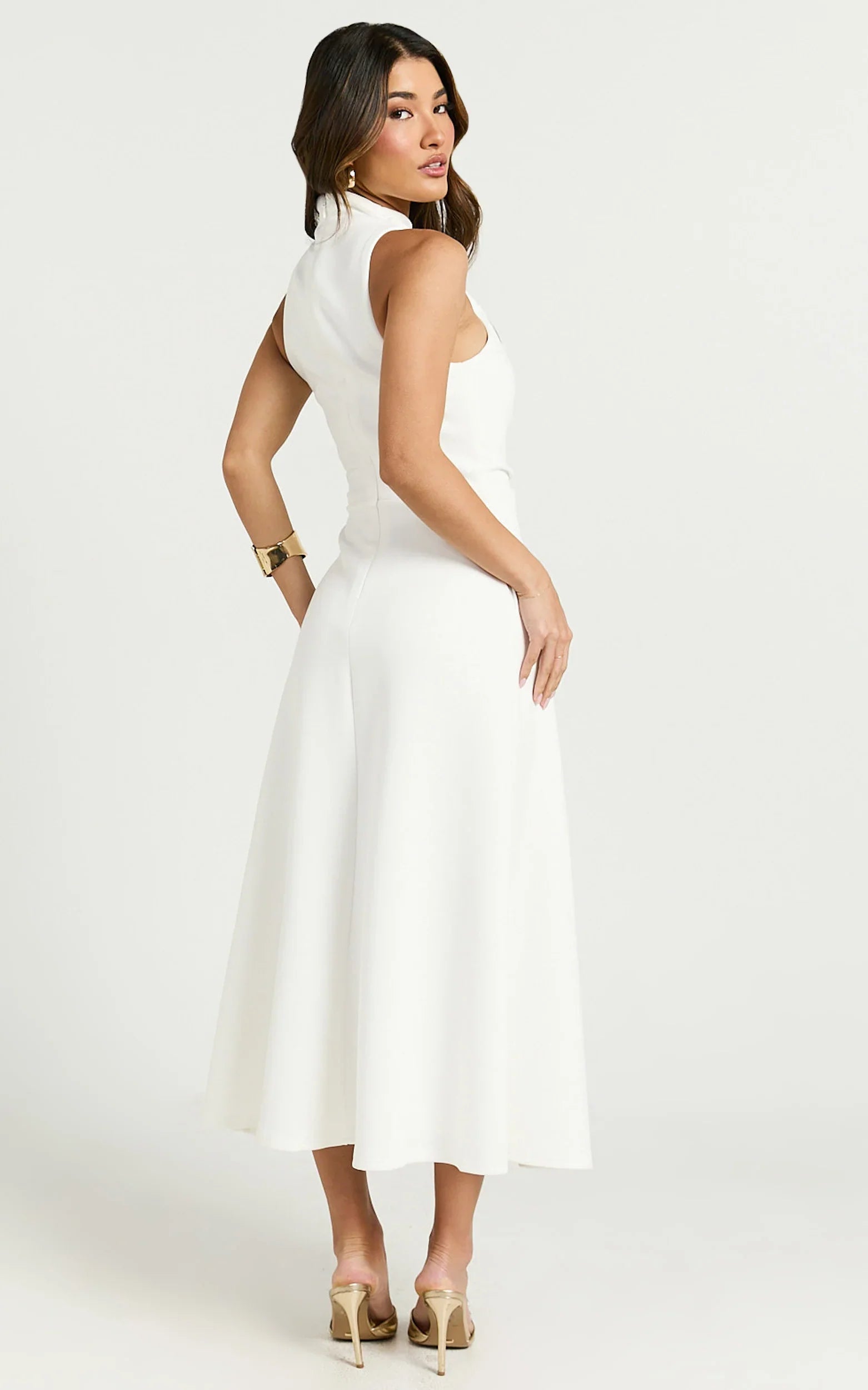 Crafted in a fresh off-white hue, this high-neck A-line silhouette flatters every figure, blending elegance with playful charm. Subtle yet statement-making, the Macy Midi effortlessly captures this season's trend of Everyday Preciousness, adding just the right touch of luxury whether you're enjoying brunch dates or romantic dinners.