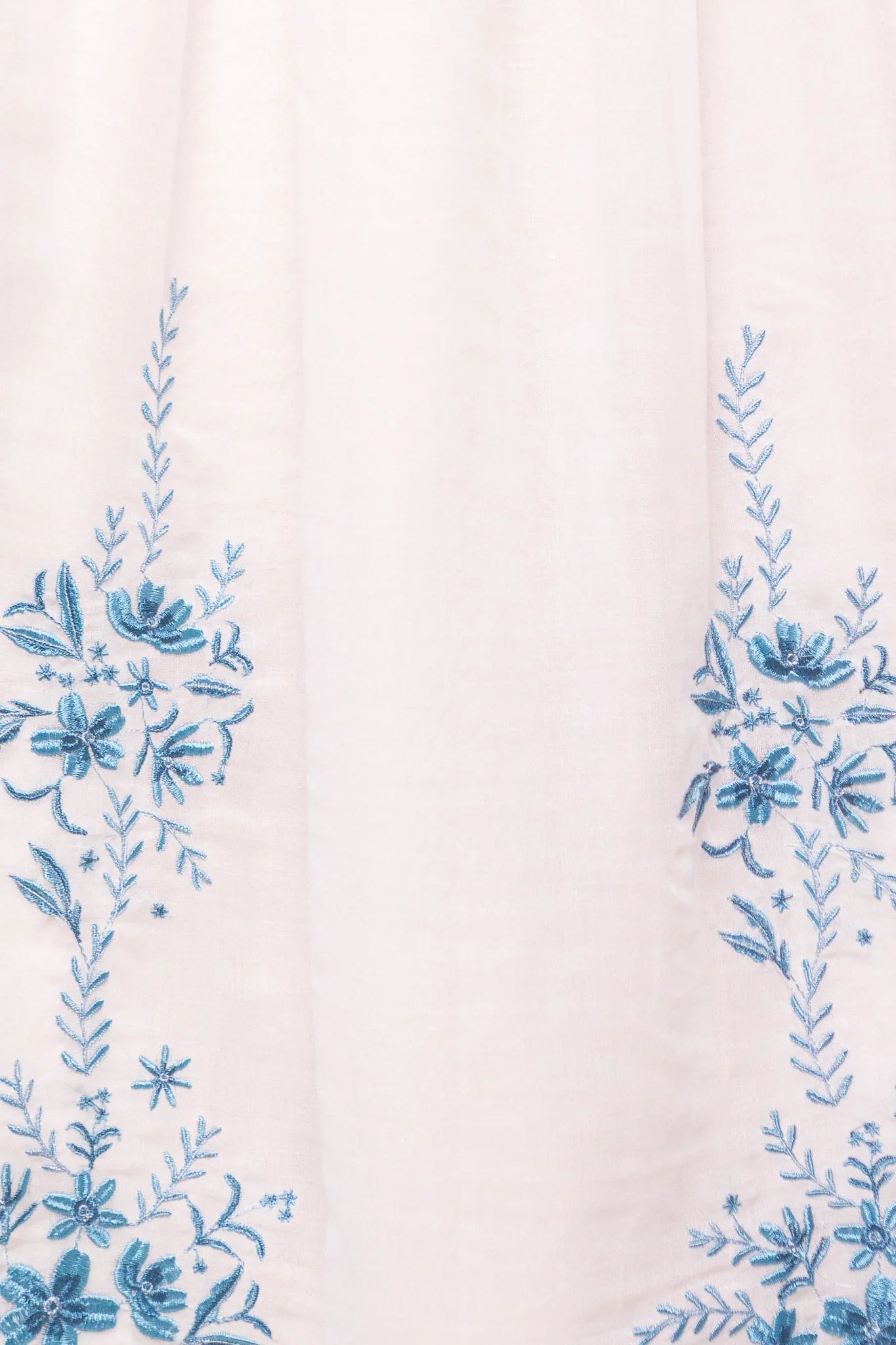 The Mae Dress is stitched with nostalgia in every thread—white cotton embroidered in blue, a square neckline framed by ruffles and an attached tie, and short puff sleeves. A smocked bodice offers ease and stretch, while the midi skirt features deep pockets for whatever the day may hold. Maternity and nursing friendly, because beauty should never come at the cost of comfort.