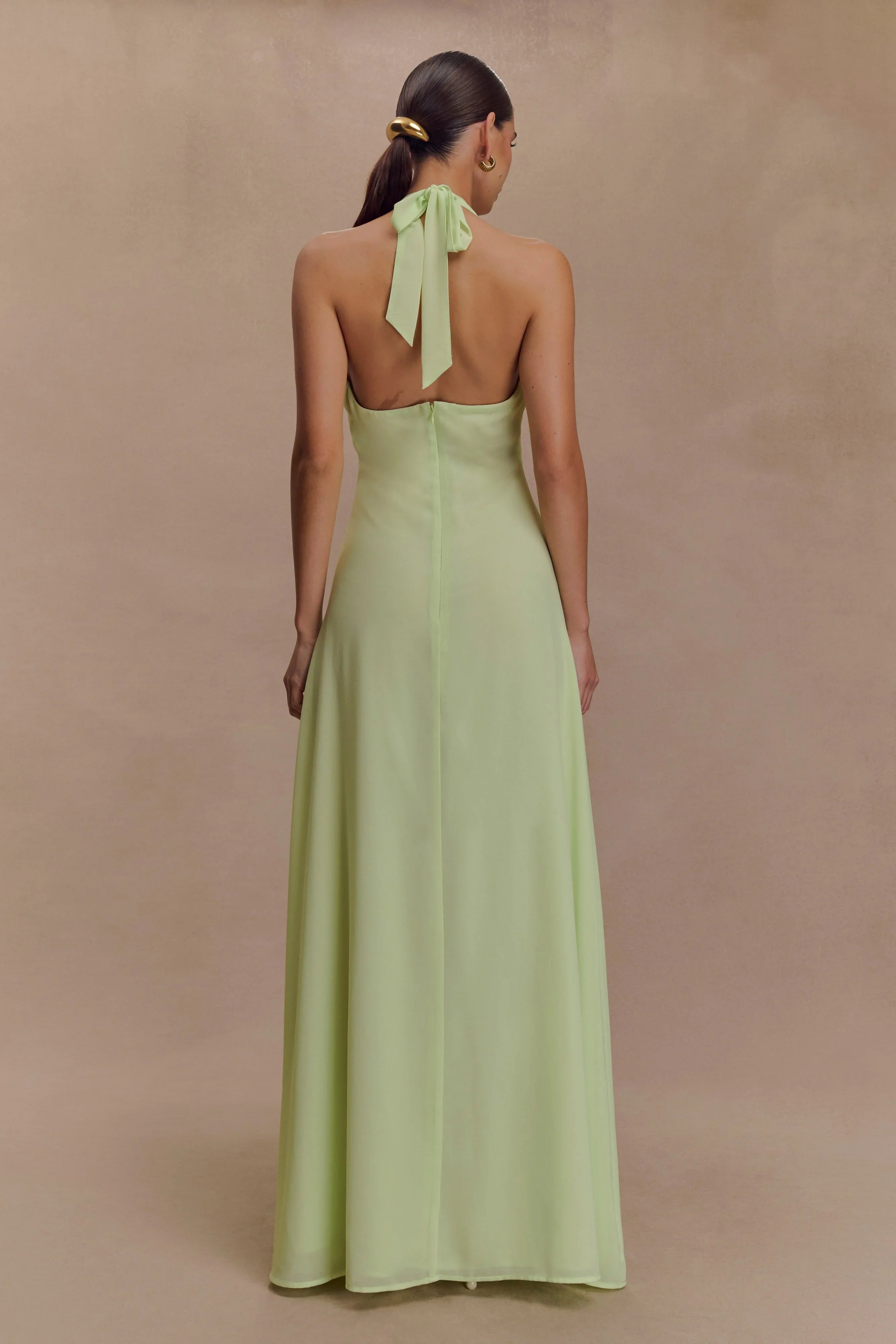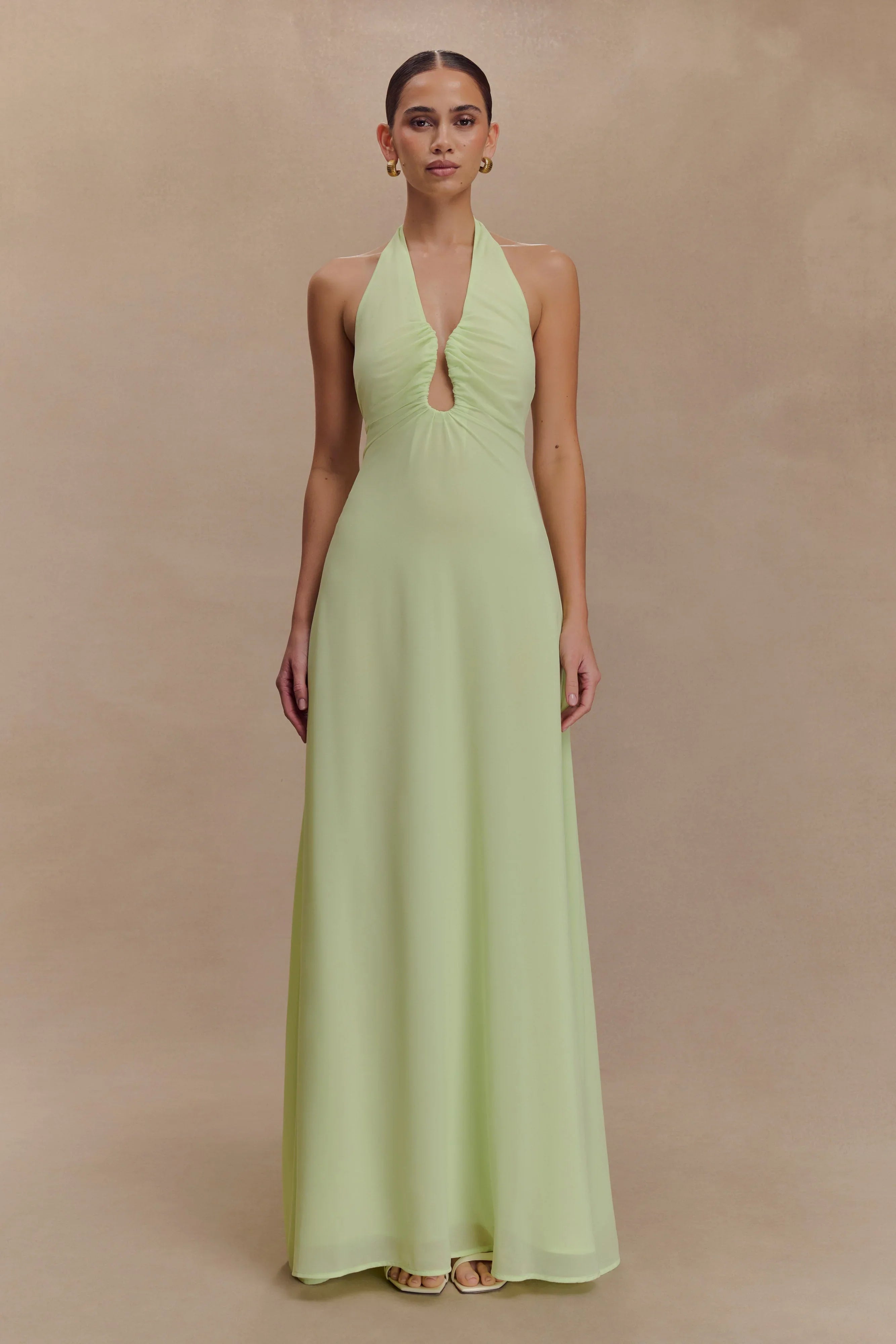 The MALAKHAI Chiffon Halter Maxi Dress is your go-to for effortless glamour, from sunlit lunches to evening soirees. Featuring a deep V halter neckline with subtle front gathering and a structured wire insert to hold its shape, this silhouette flatters with a bodycon fit through the bodice and a soft A-line flare at the hips. A side seam invisible zipper keeps the finish clean, while the sleek hardware neck closure adds a refined edge. Fully lined and designed without padding for a natural, easy fit, this dress is made to move with you from day to night.