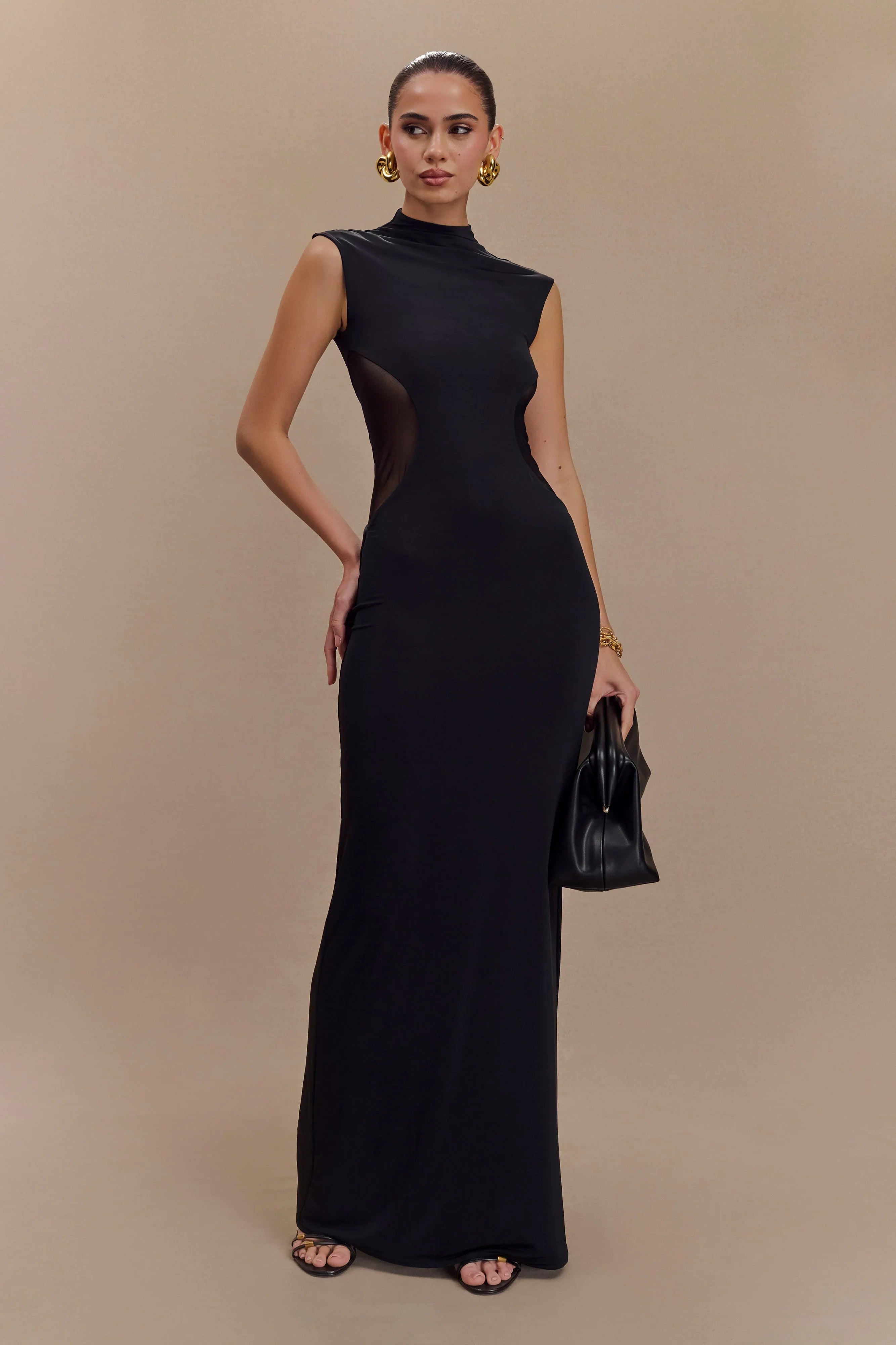 Embrace elegance with the MASSIE Slinky and Mesh Maxi Dress, a stunning blend of sophistication and modern design. Featuring a graceful grown-on neckline and wide shoulder shape, this bodycon dress hugs your curves and flows into a refined maxi length. Contrast hash panels at the waist cinch your figure for an hourglass silhouette, adding visual intrigue. Fully lined for comfort, the Massie dress is perfect for formal events, nights out, or special celebrations. Elevate your wardrobe with this versatile piece, where contemporary style meets timeless appeal.