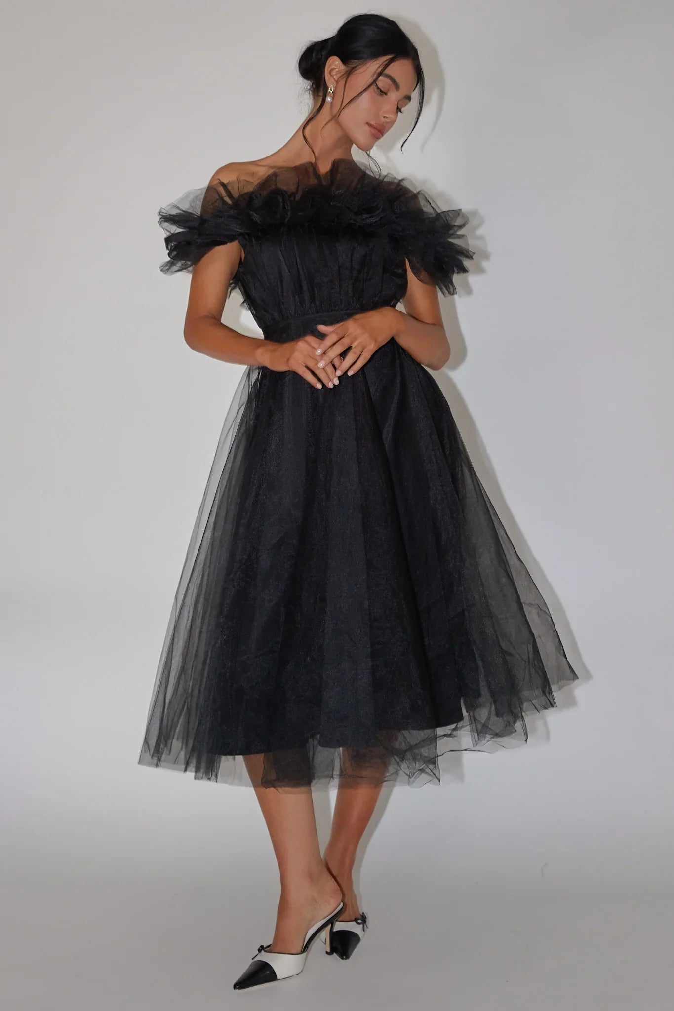 You will light up the room in our stunning May Rose midi dress. Featuring a tulle, frill-trimmed neckline and off-shoulder style. Perfect for a wedding or special birthday celebration. Team it with diamante heels and a clutch for a look that's fit for Cinderella.