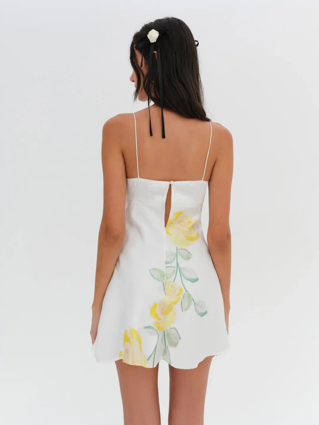 Designed for sun soaked days and the warmest golden hours, the Millie yellow mini dress is crafted in a silky satin and features oversized watercolor roses that echo the ripples of summer tides. This short slip dress has a ruched twist-front bodice and slightly flared skirt for a flattering, wear-everywhere fit.