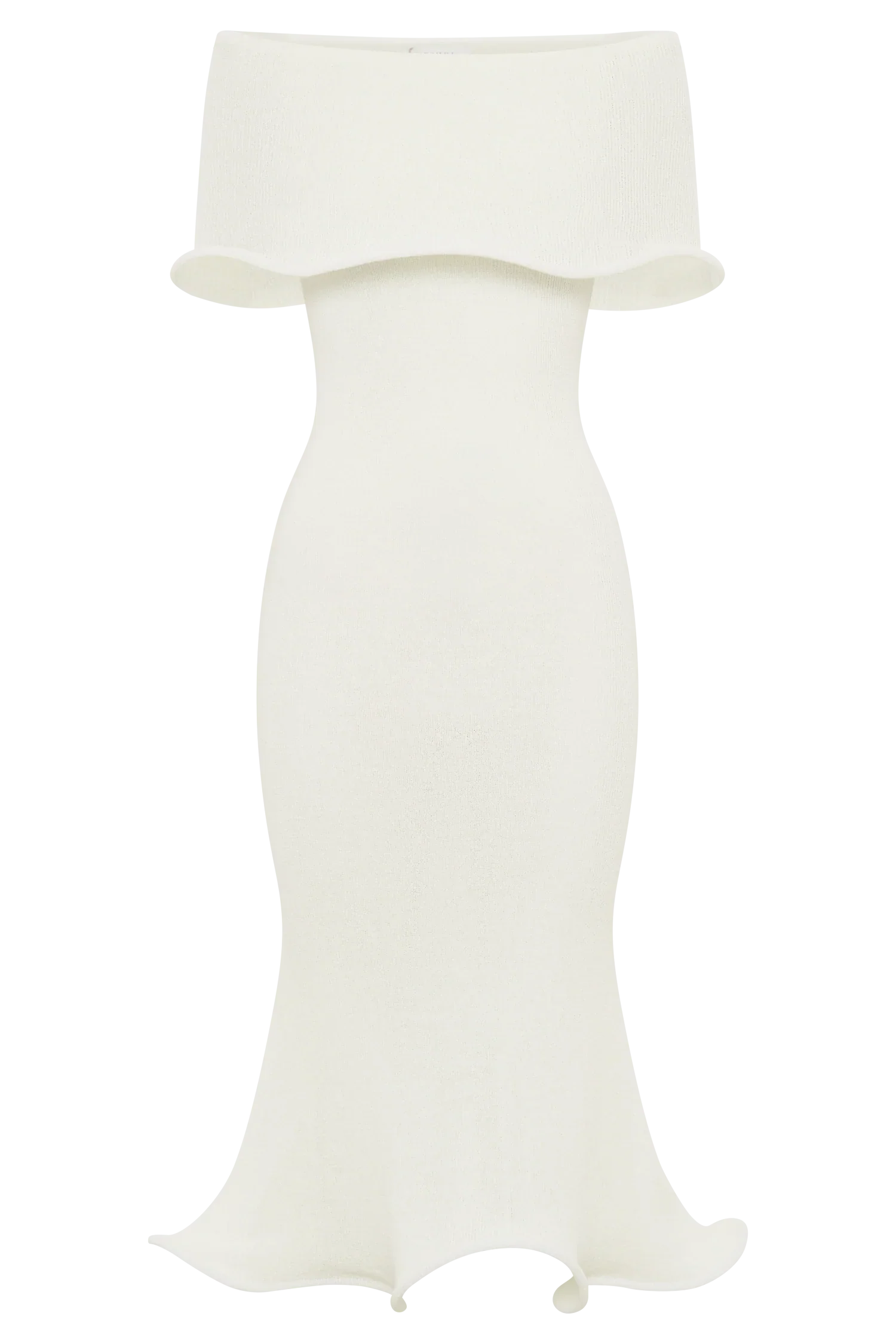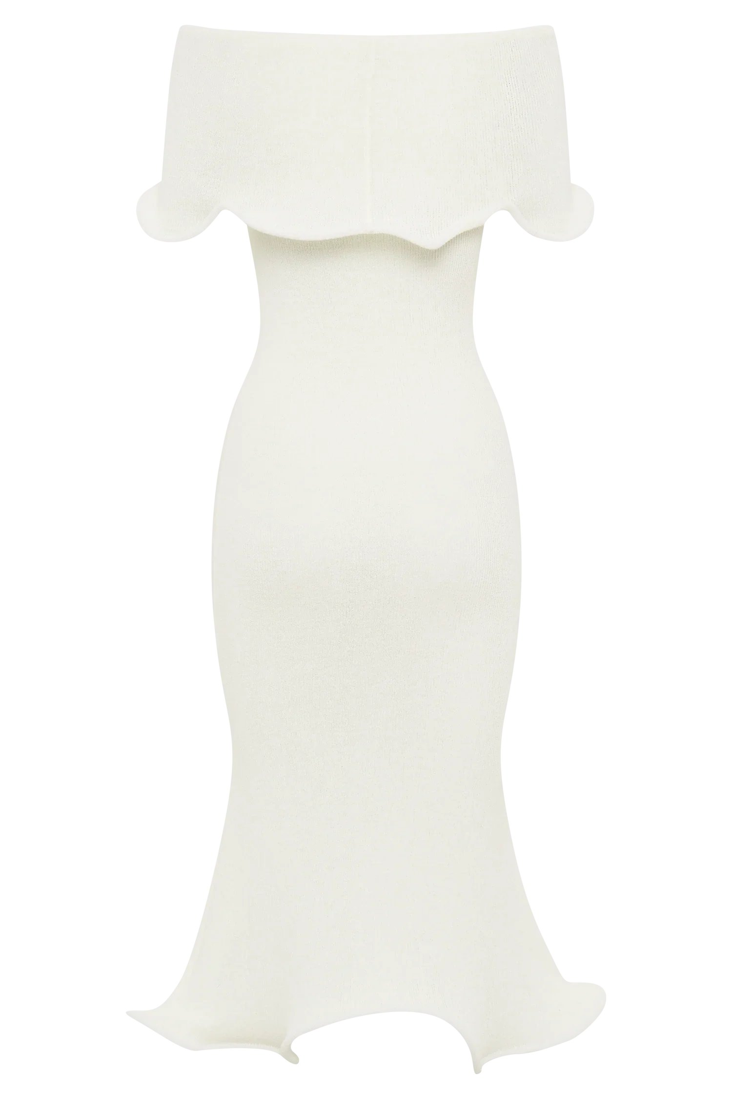 The MOLLY Off Shoulder Knit Midi Dress is the epitome of effortless elegance. This bodycon dress features a flattering off-the-shoulder design with an overlay that adds a touch of sophistication. The wire ripple hem brings a unique and stylish flair, while the unlined knit construction ensures a comfortable fit. Falling to a chic midi length, this dress is perfect for making a statement at any event.