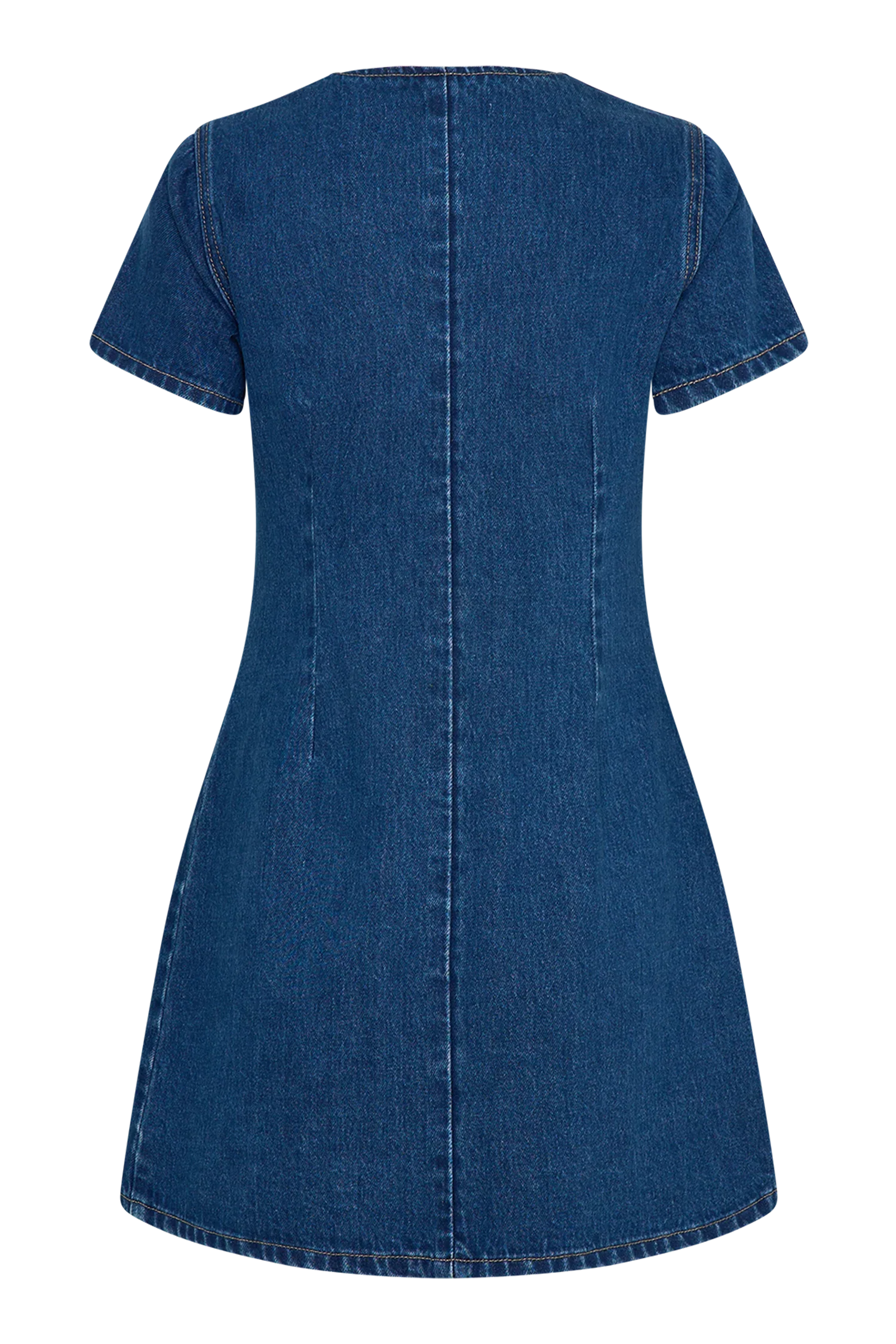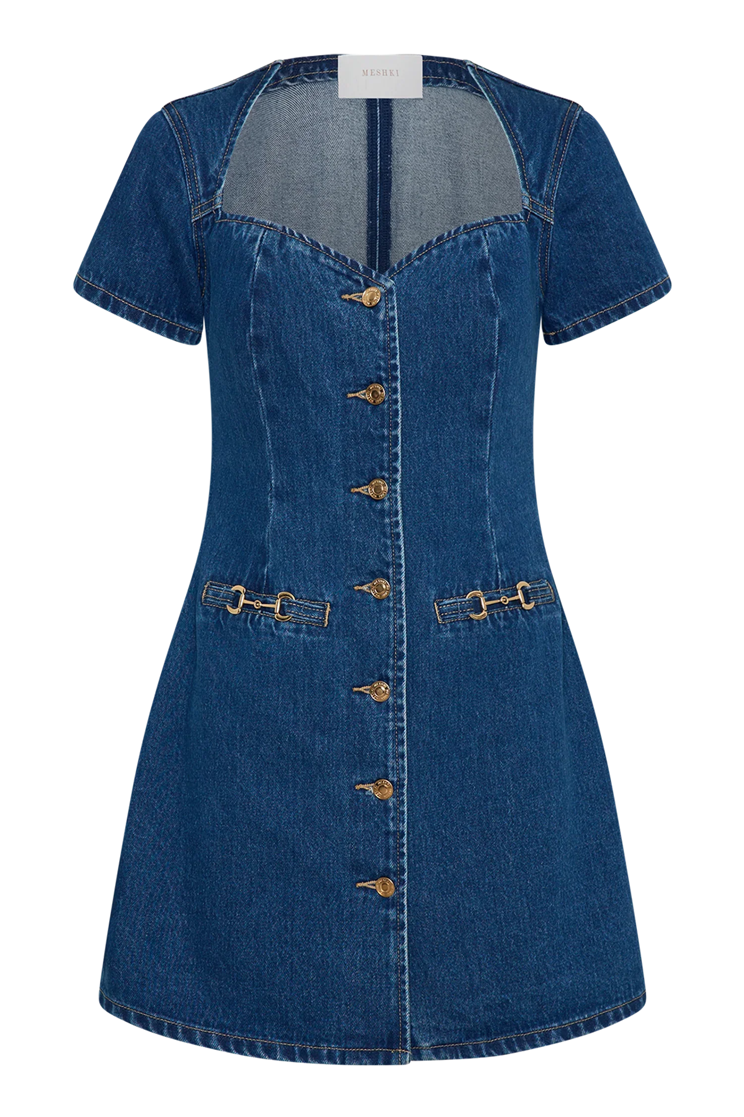 Add a touch of playful sophistication to your wardrobe with the MONICA Sweetheart Denim Mini Dress. Featuring a flattering princess neckline and charming short sleeves, this dress exudes feminine elegance with a modern twist. The functional button-front closure allows for customisable styling, while the mini length keeps the look fresh and flirty. Non-functional front pockets with special buckle hardware add a unique, edgy detail that sets this denim dress apart. Perfect for casual outings or dressing up with heels and accessories, this dress effortlessly combines timeless denim with contemporary style.
