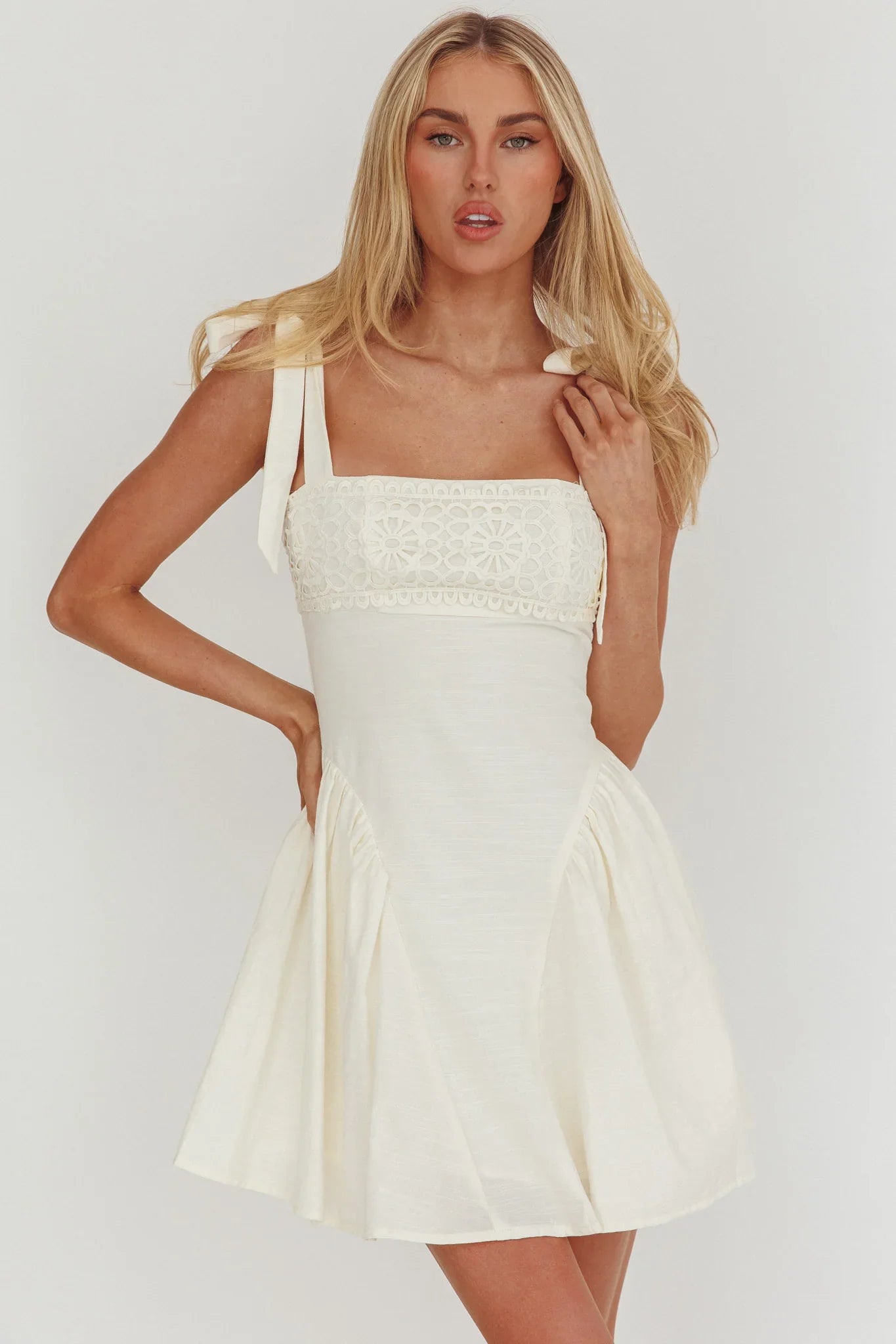Hello, gorgeous! You will look like a dream in our pretty Morgana mini dress. It features tied shoulders and the prettiest applique detail in the bust. Perfect for a birthday brunch with your girls teamed with pointed toe heels and a purse for a super cute look.
