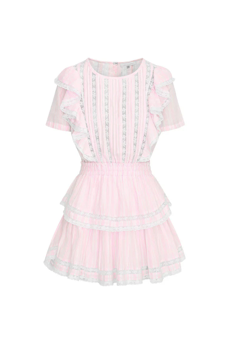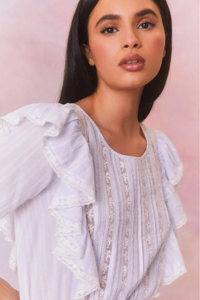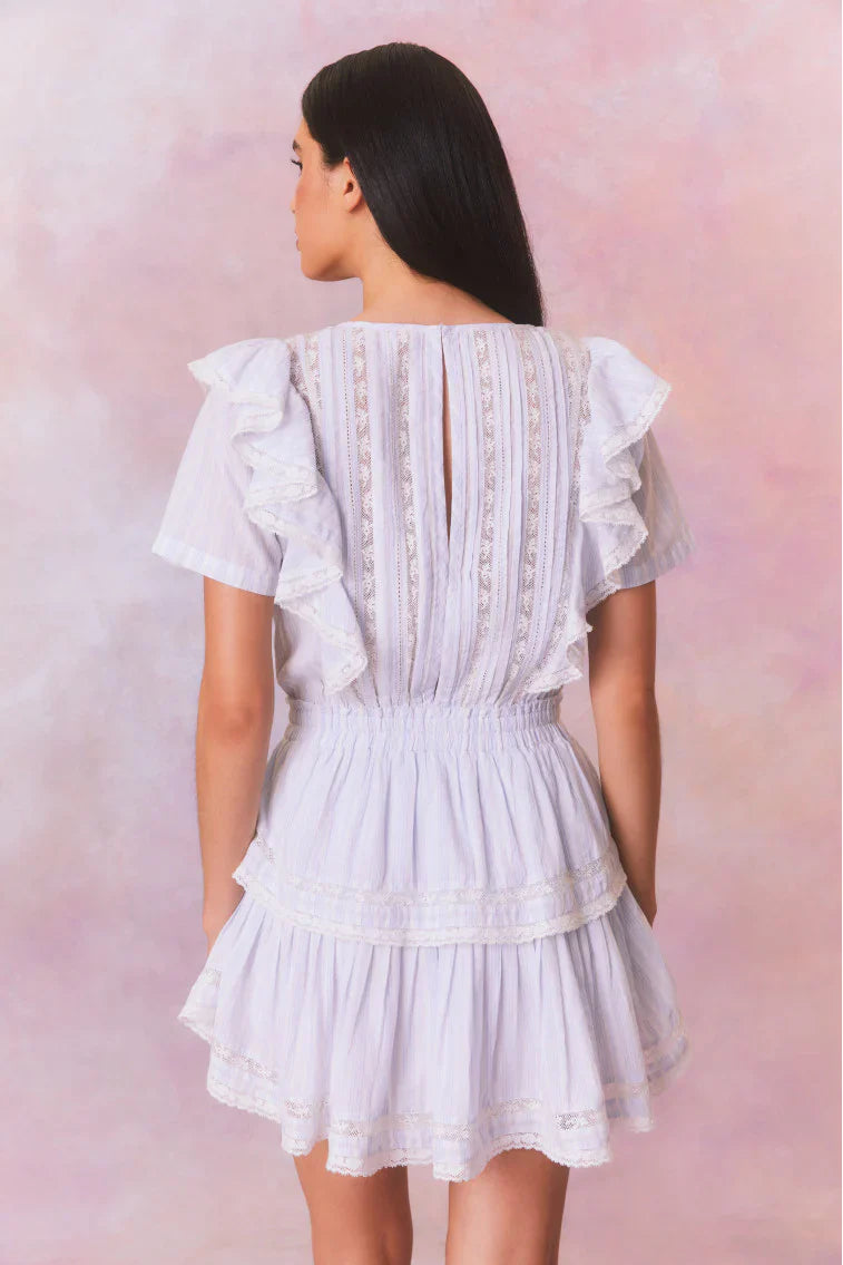 Our signature Natasha Dress returns for the season with a new summer-inspired blue-and-white striped fabric. This easy frock features double ruffled flutter sleeves, which cascade down the front and back of the body to highlight the elasticated waist. Intricate custom lace panels are inset and trim the skirt’s flounces.