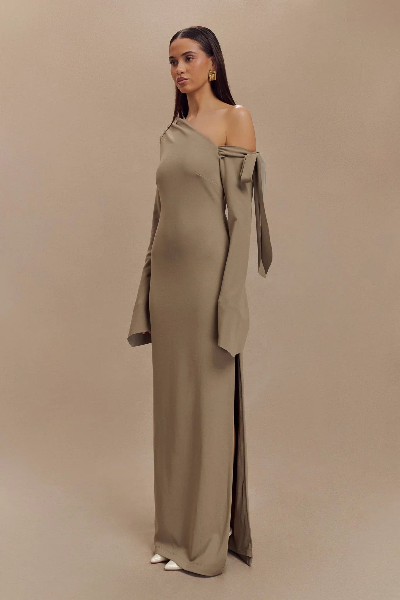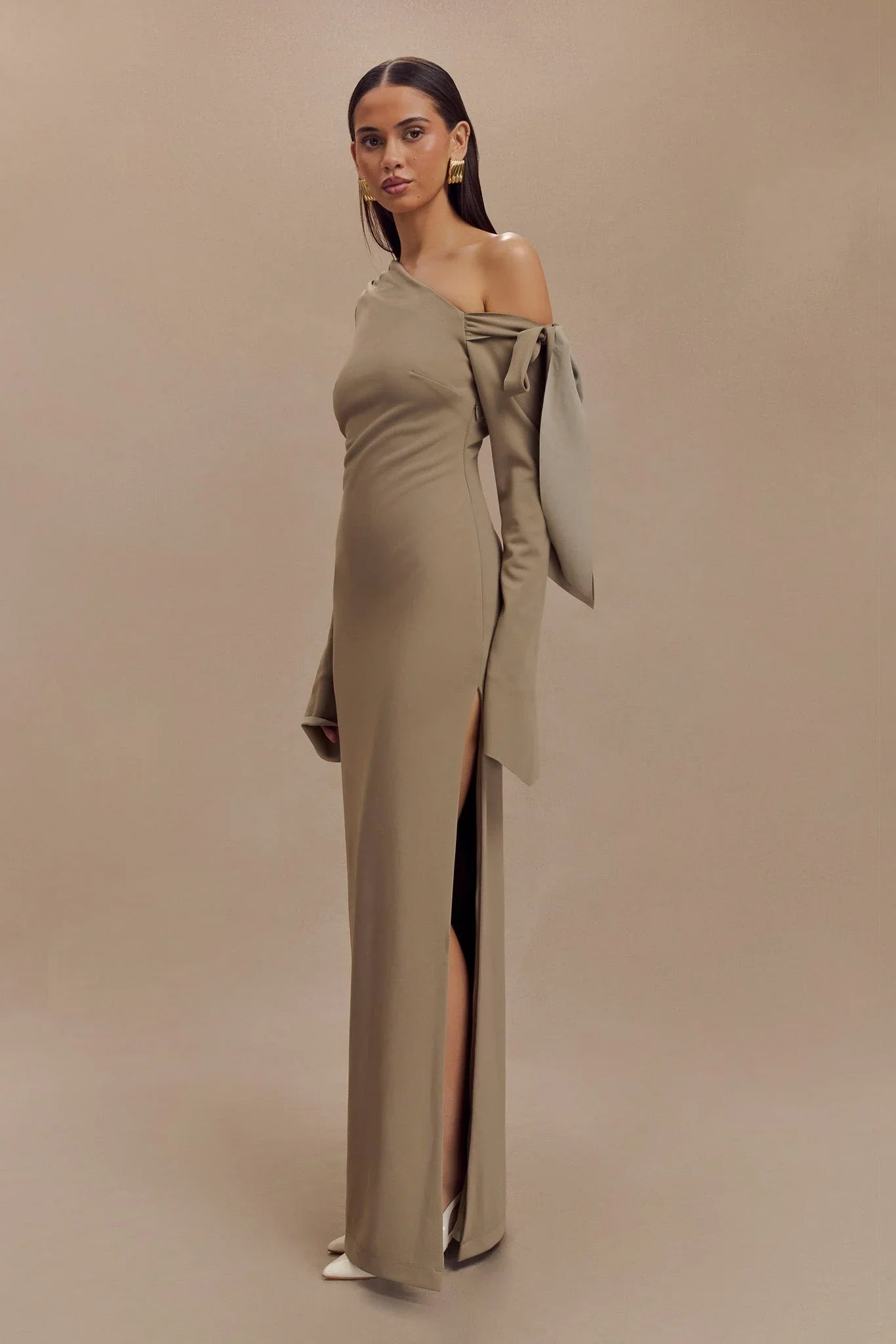 The NICOLA One Shoulder Crepe Maxi Dress is a stunning blend of modern elegance and timeless sophistication. Featuring an asymmetrical neckline with a chic open shoulder and ruched detailing, this dress exudes contemporary glamour. The ruching at the waist enhances the silhouette, creating a flattering, body-skimming effect. With a functional tie at the shoulder for adjustable styling, a side zip for a smooth fit, and stretch fabrication for added comfort, the Nicola Dress ensures a perfect blend of form and function. The long sleeve and fully lined design provide both coverage and a refined finish, making this maxi dress ideal for any formal or special occasion.