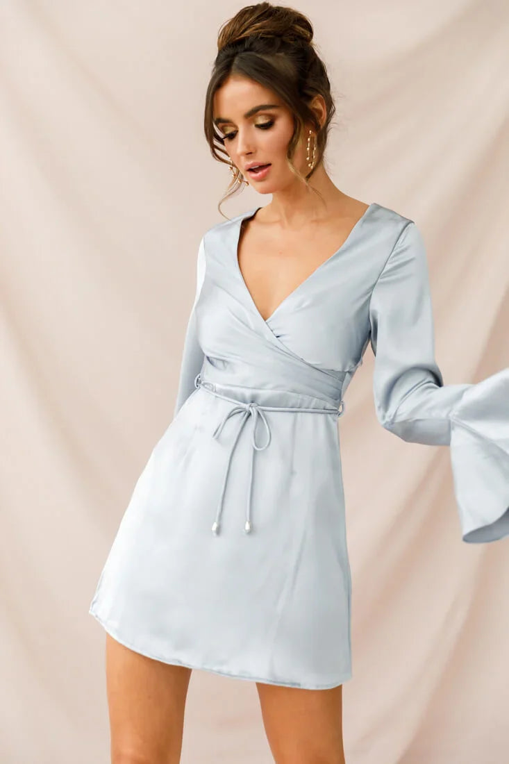 Get everyone's attention in this silky number. Those flared cuffs are giving us a sexy 70's vibe and we don't mind. Featuring a crossover V-neckline and spaghetti-thin string tie around the waist, you'll feel like hitting the disco and dancing 'til dawn. Team it with some metallic platform heels and hoop earrings, groovy baby!