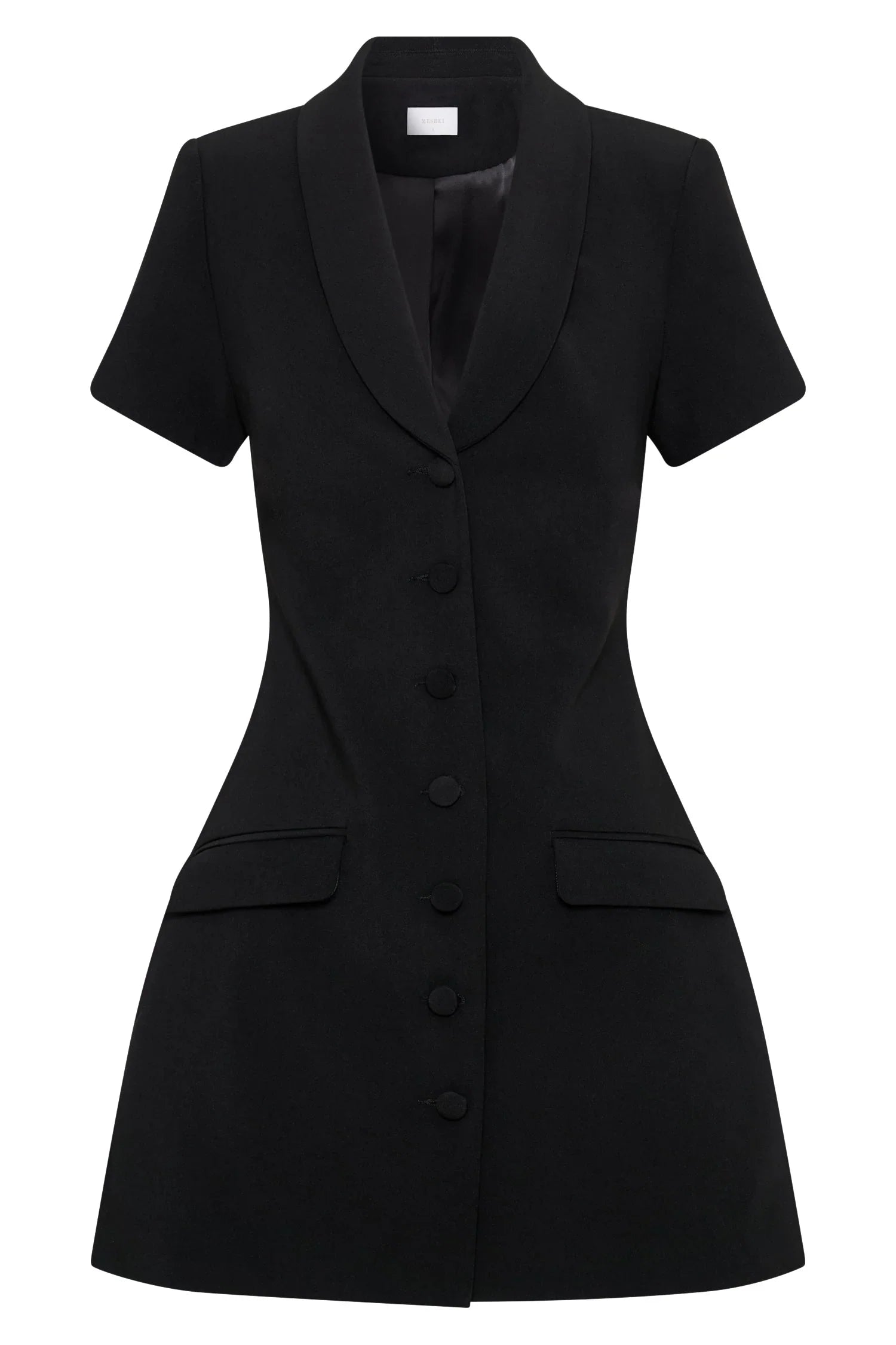 The PAOLINA Collared Suiting Mini Dress is a chic and sophisticated addition to your wardrobe. Featuring a V neckline with a collar and lapel, it exudes timeless elegance with a hint of modern flair. The functional center front button closure adds a touch of polish, while the non-functional front pockets offer a stylish detail. With short sleeves, it's perfect for warm-weather wear, and the mini length adds a flirty touch to the ensemble. Whether dressed up with heels for a formal occasion or styled casually with flats for a daytime look, the Paolina Mini Dress is sure to make a statement with its effortless charm and versatile style.