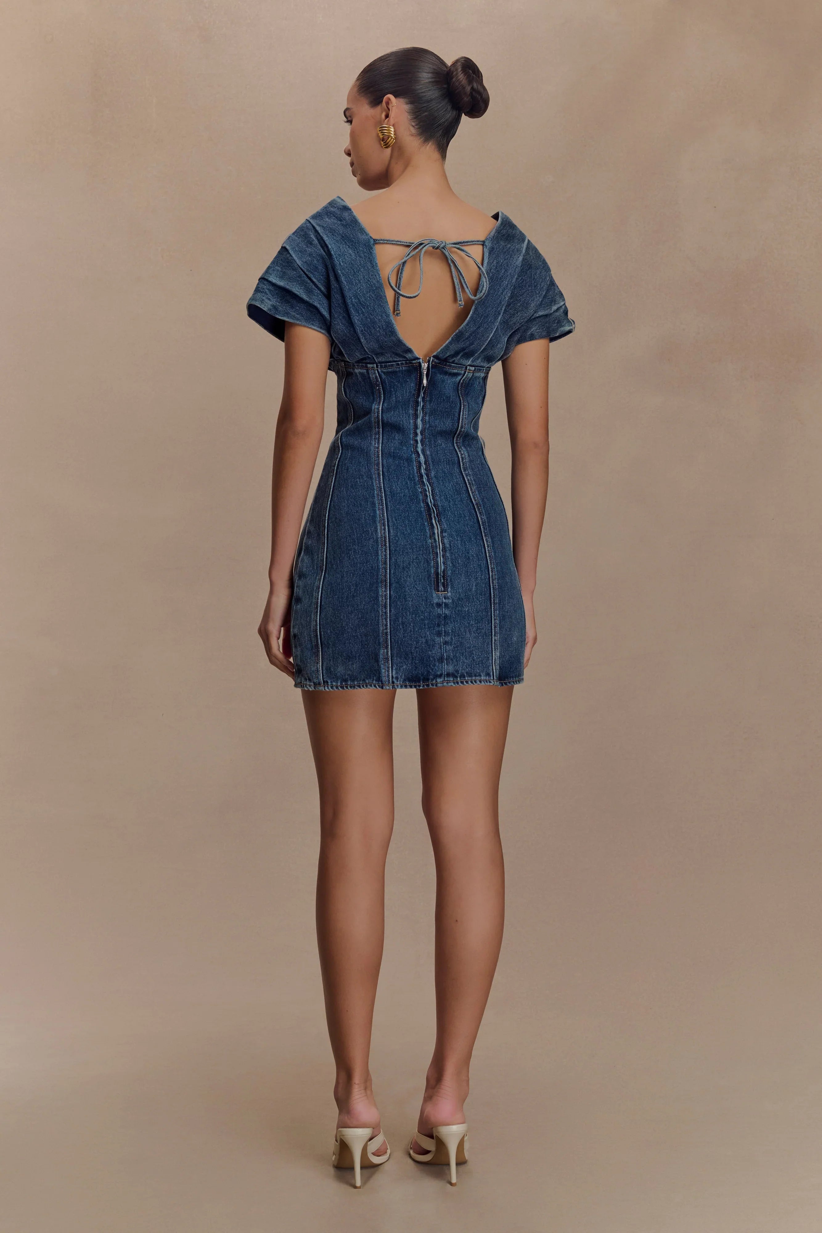 The PASCALE Off Shoulder Denim White Dress brings a fresh take to feminine tailoring. Designed with a Bardot neckline and crossover detail at the front and back, this mini silhouette combines sculptural shape with flattering pleat accents through the bodice. A fitted waist enhances the form, while the mini length keeps it modern and playful. Finished with a back zip for a seamless fit, this dress is your go-to for elevated denim with a romantic twist.