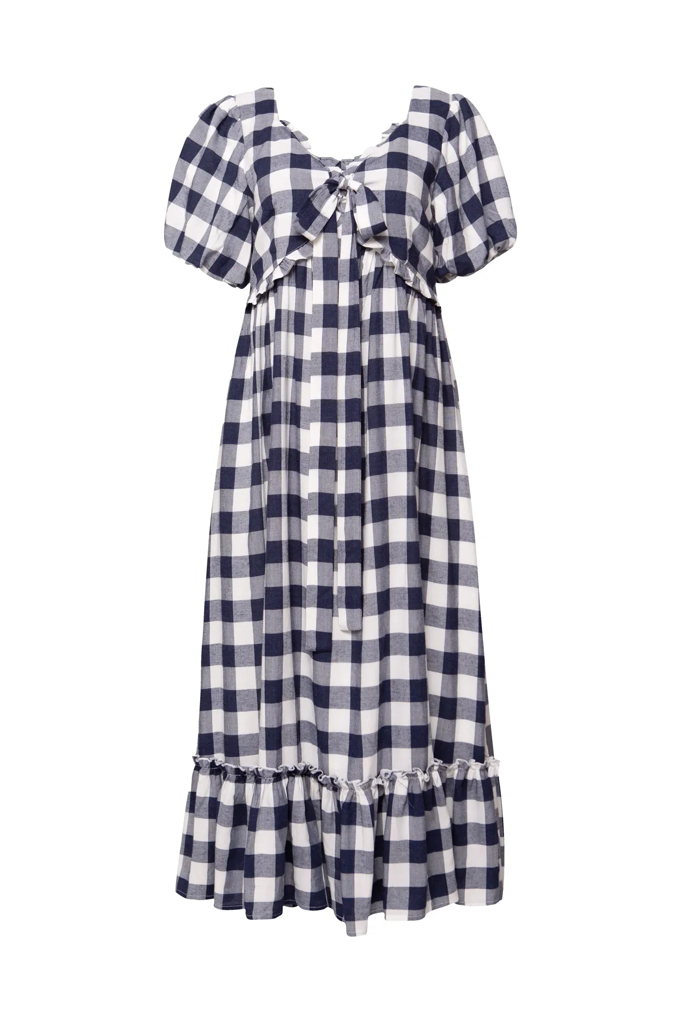 A dress made for moments of laughter, love, and leisure. The Picnic Dress in navy gingham features a sweetheart neckline with a playful tie detail, while puff sleeves and a ruffled, ankle-length skirt add a touch of whimsy. Hidden pockets keep things practical, and the smocked back panel ensures a comfortable, flattering fit.
