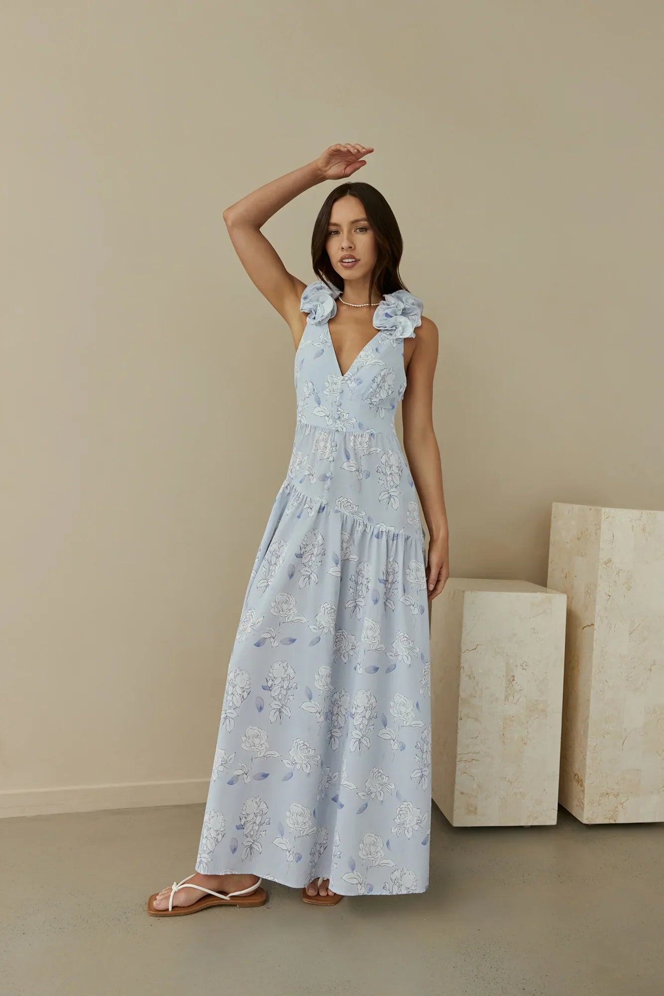 The Pretty Smile Maxi Dress features a floral print with frill shoulder straps, a crisscross back, and a flowy skirt — the perfect blend of sweet and stylish for sunny days. Style with heels.