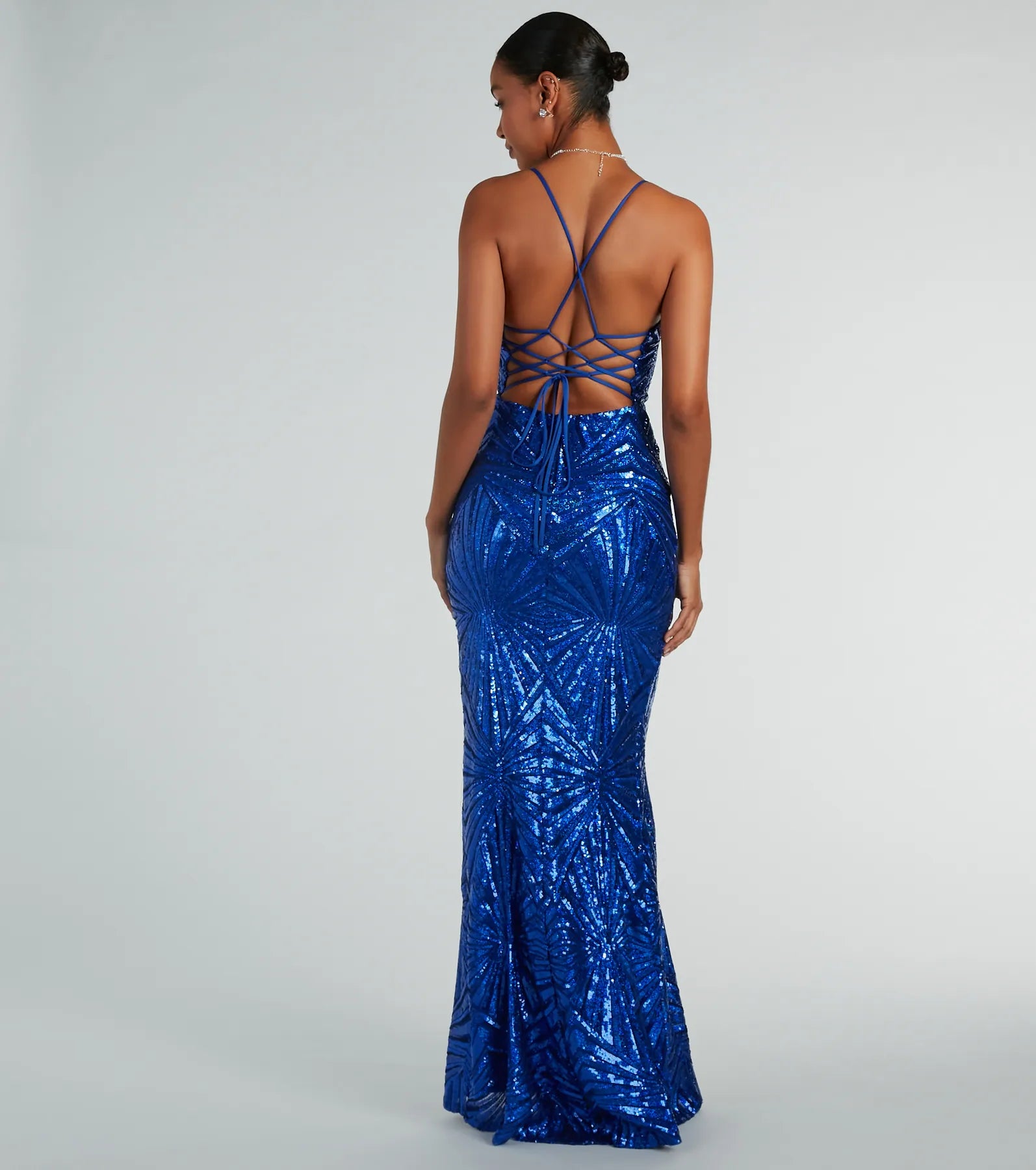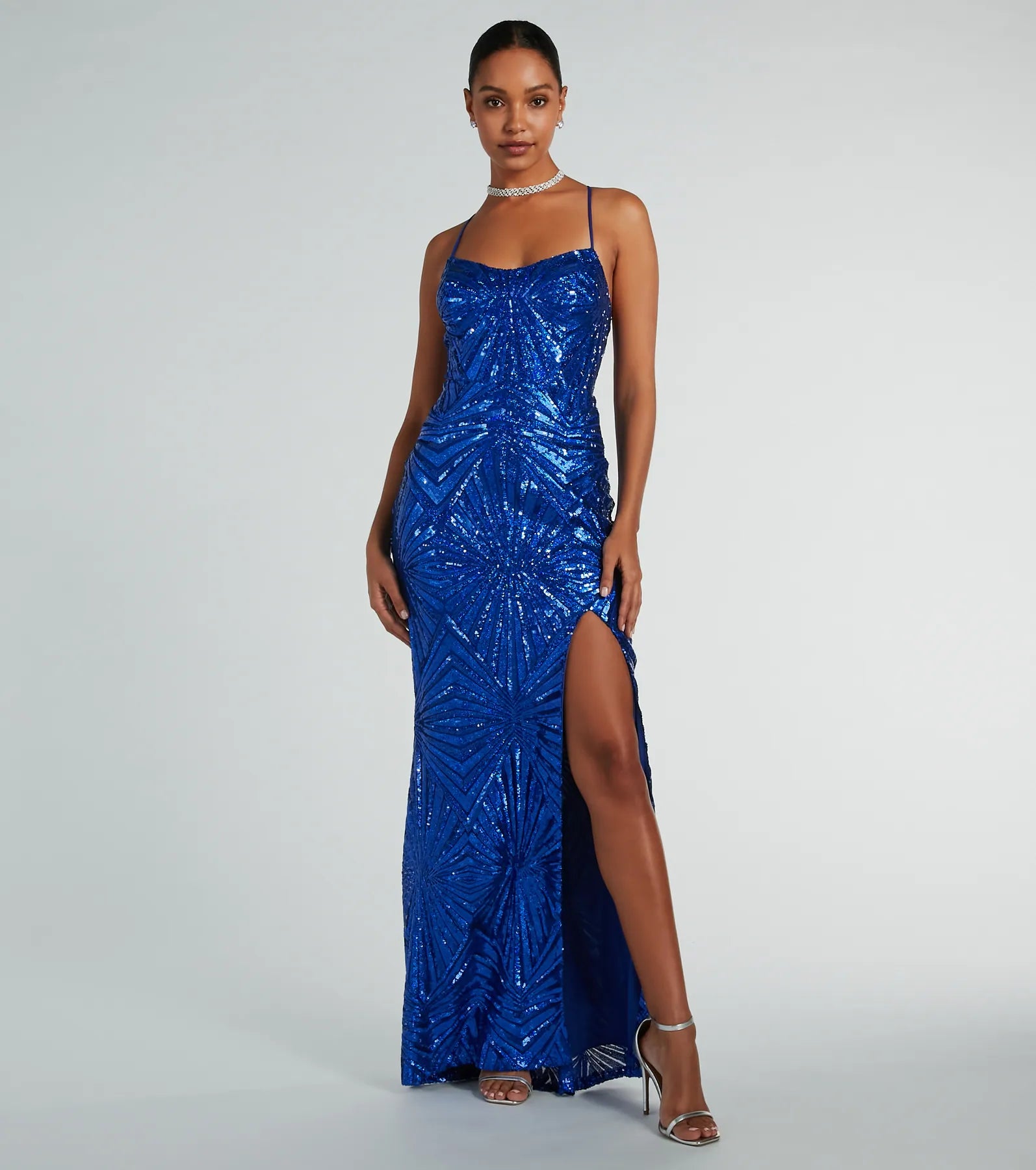 The Regina sequin formal dress is the head-turning gown you're after for prom 2024 or upscale birthdays! Crafted from a sequin pattern mesh fabric that adds a touch of glamour to any formal event. She boasts a flattering scoop neckline and padded bra cups for support, while spaghetti straps and a lace-up back add a touch of sophistication. The mermaid silhouette and high front slit create a dramatic effect, perfect for making a statement along the floor-length hem. Complete the look with a clutch and .