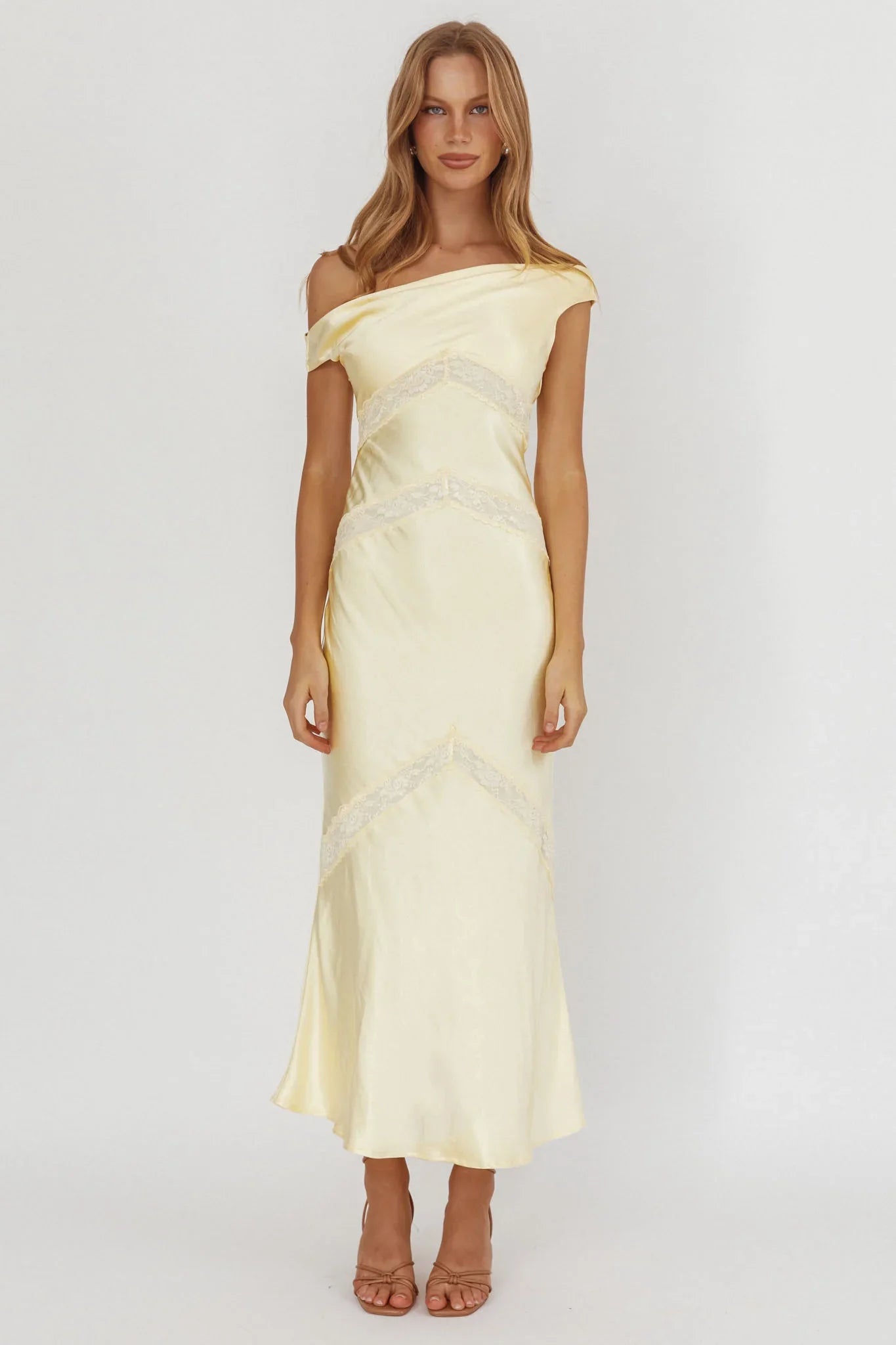 You will look like you just stepped off the red carpet in our gorgeous Revelation maxi dress. It features an off-shoulder design with the prettiest lace trim inserts. Wear it to a wedding or special event teamed with nude heels and a clutch for an unforgettable look.