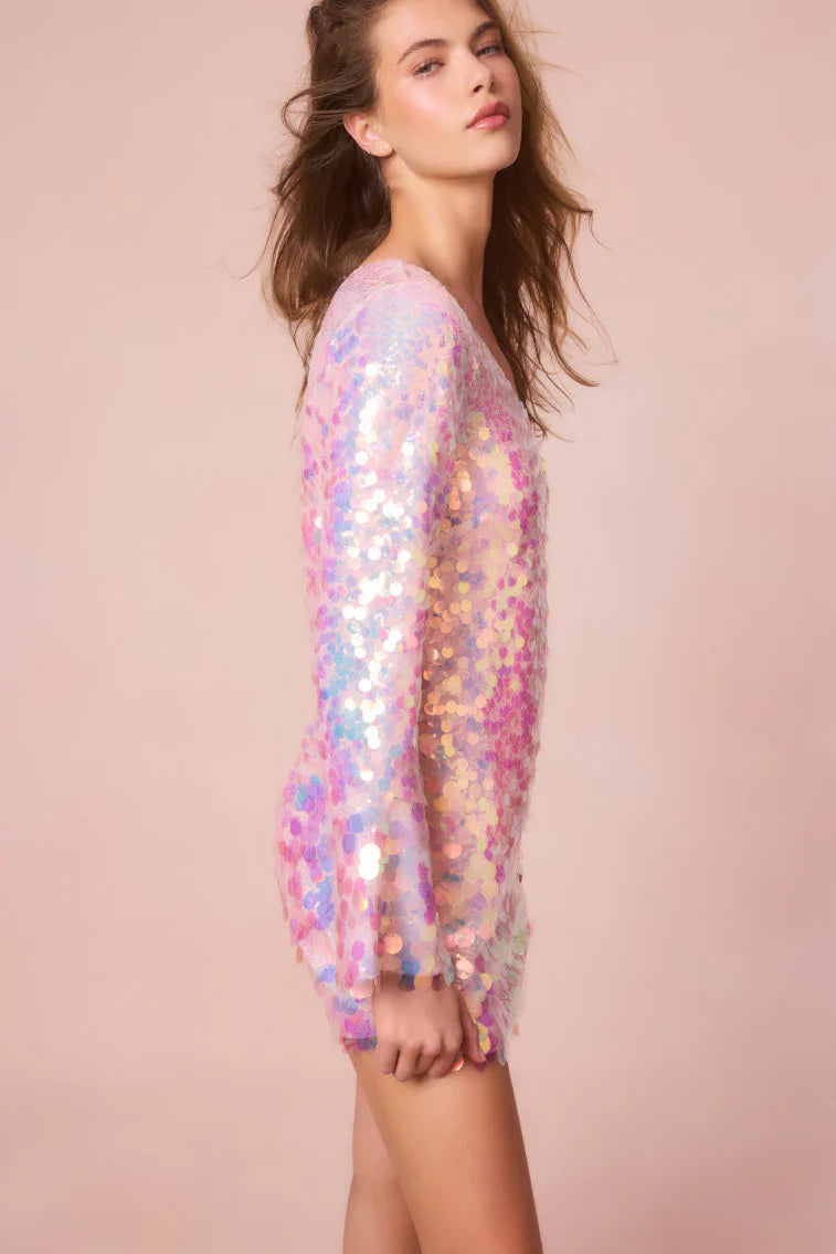 Disco dream comes true in the Risbo Dress. This mermaid-inspired party dress debuts with iridescent, light-catching paillettes that gradually go from smaller to larger as the flow down the mini dress. A body-skimming silhouette gives this piece a flattering fit. Designed for dancing, this stunning piece is ideal for your next holiday party or New Year’s Eve.