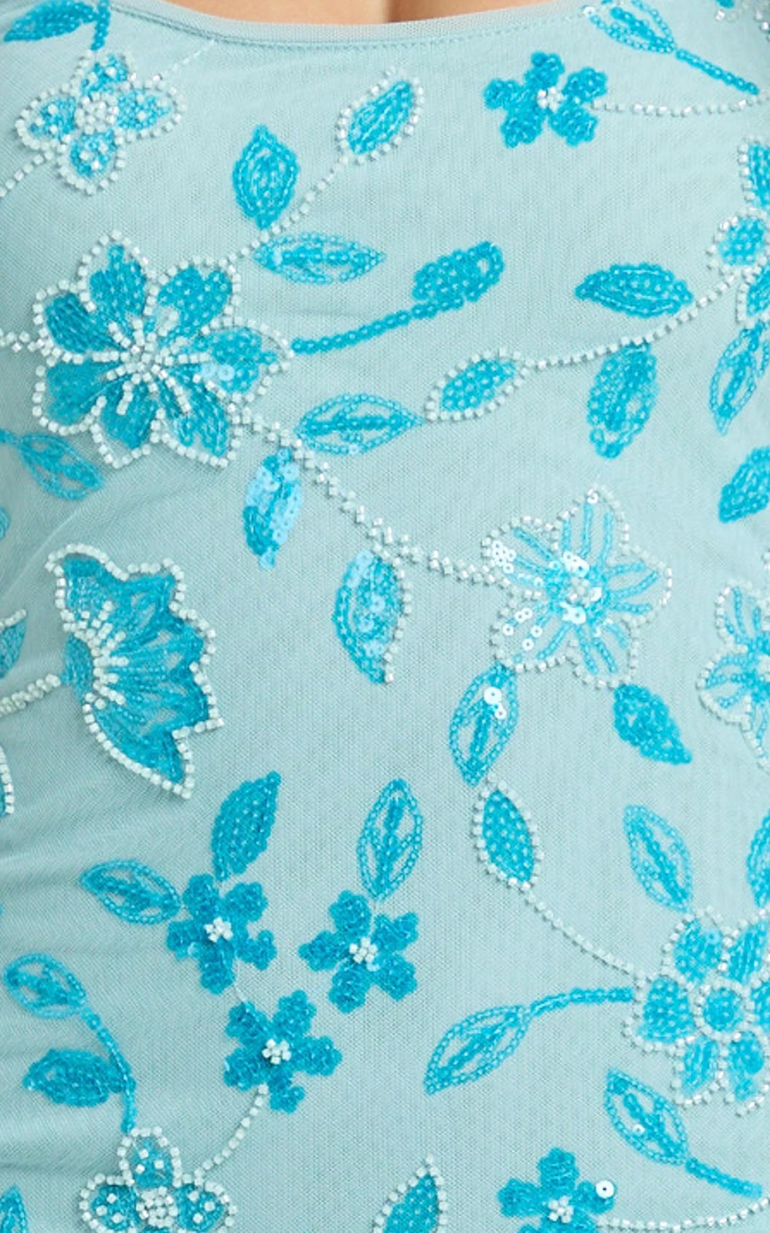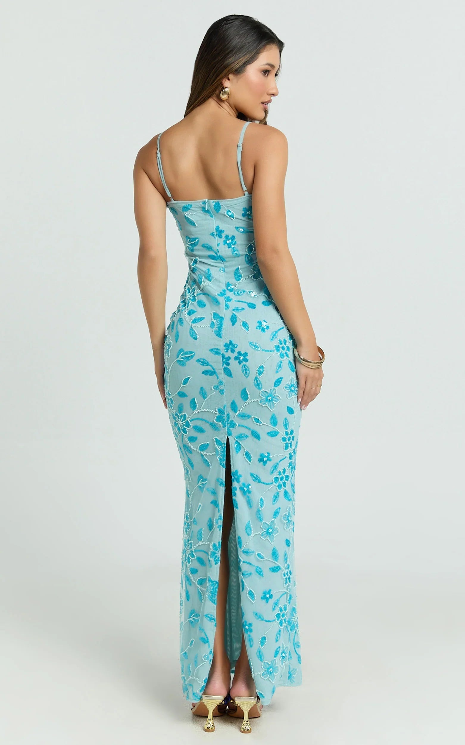 Featuring shimmering blue sequins on delicate mesh fabric, an elegant scoop neckline, and subtle strappy detailing, this stunning maxi dress accentuates your curves beautifully. Its sleek, column silhouette ensures you'll be the center of attention at any event.