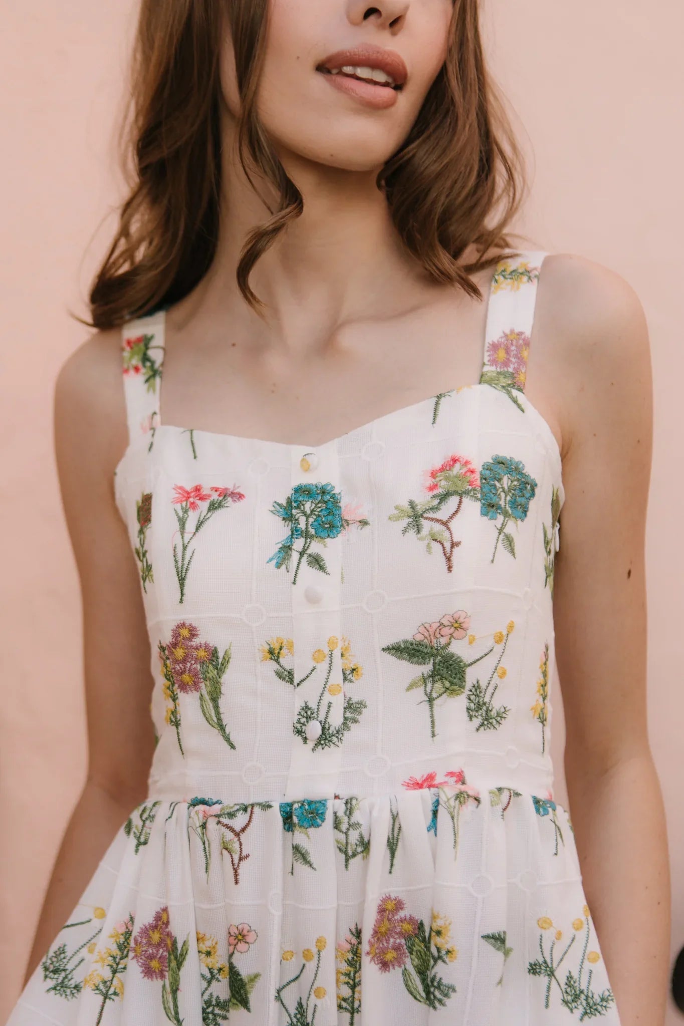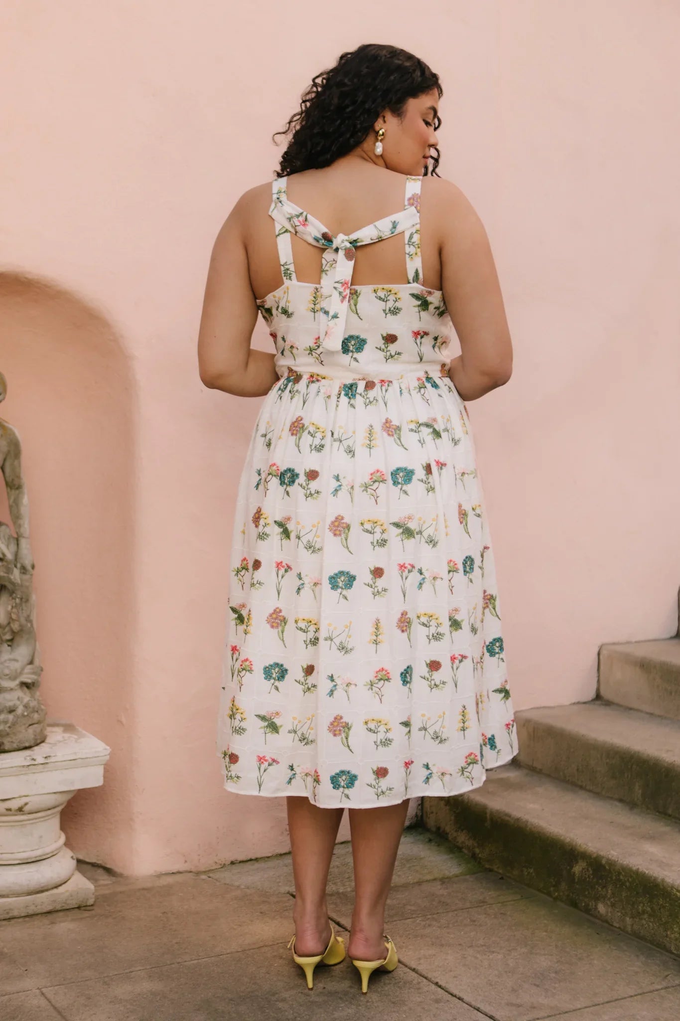 Be a vision of whimsy in the Robyn Dress! Crafted from an embroidered floral and cream fabric, this midi dress features a slight sweetheart neckline and princess seams for a flattering fit. The playful bow on the back adds a touch of fun, while hidden side pockets and a zipper provide functionality. Slip it on and let every moment feel like a fairytale!