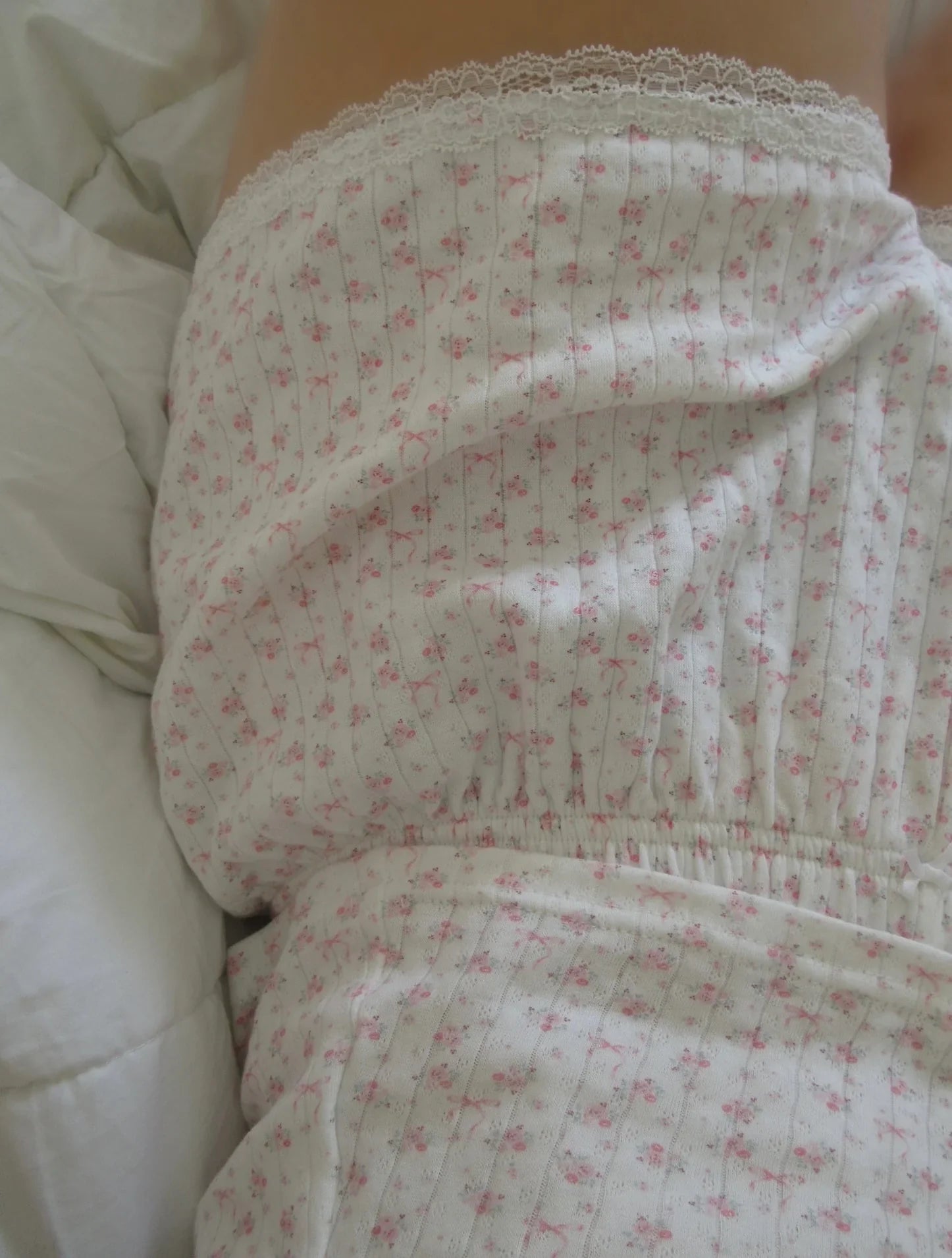 Our soft cotton shorts feature an elastic waistband, delicate lace trim, and a tiny white bow. Entirely detailed with blush pink bows and adorable floral bouquets.