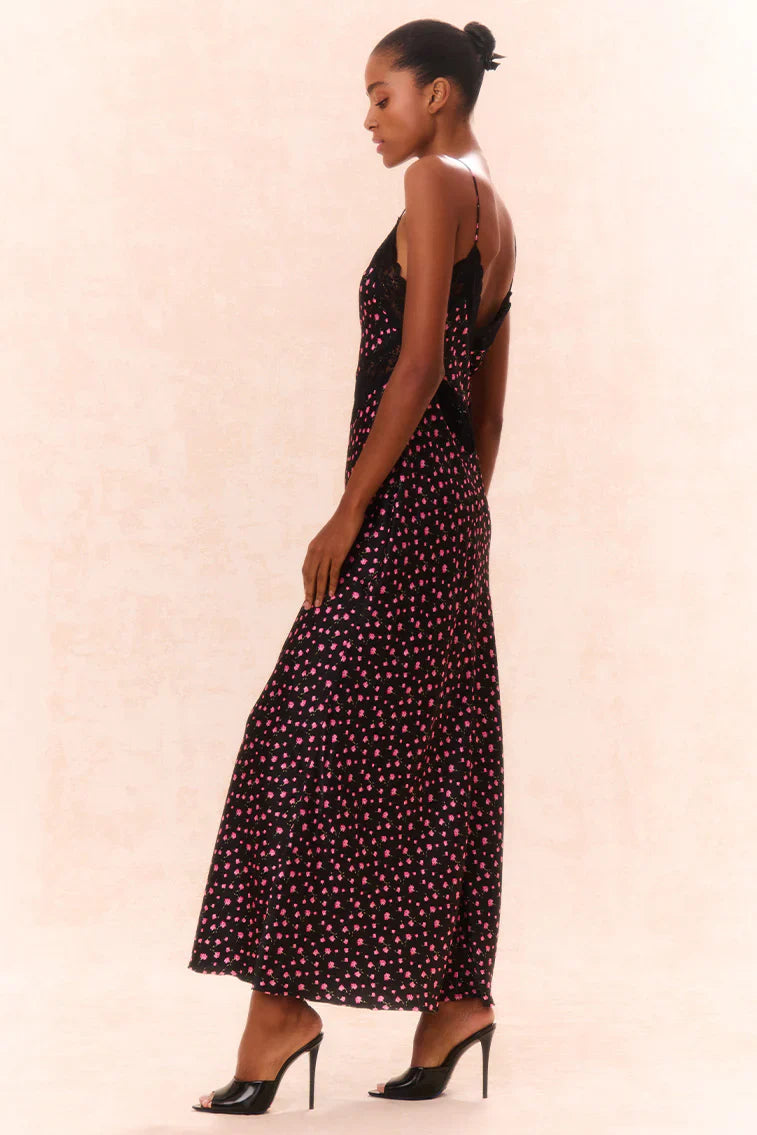 Everyone’s favorite Serita Dress is back for the fall, this time in a lightweight, hammered silk fabric featuring a playful ditsy rosette print all over. With a drapey silhouette, this bias cut slip dress features gorgeous contrasting lace at the neckline and the waist. The lace is backed with a bit of chiffon for a flirty finish and easy coverage. The maxi has delicate spaghetti straps.