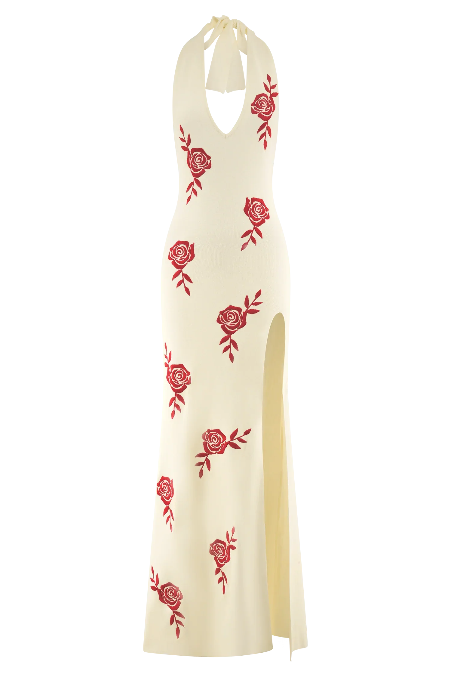 The SHILOH Rose Knit Halter Maxi Dress is the epitome of chic, with a plunging neckline and halter design that highlight your neckline and shoulders. The adjustable tie ensures a perfect fit, while the open back adds an alluring touch of elegance. With its stunning embroidered rose detail, this dress blends femininity and sophistication seamlessly. The leg slit adds an element of drama, allowing for ease of movement and a glimpse of leg. Crafted from soft knit fabrication, this dress provides comfort without compromising style.