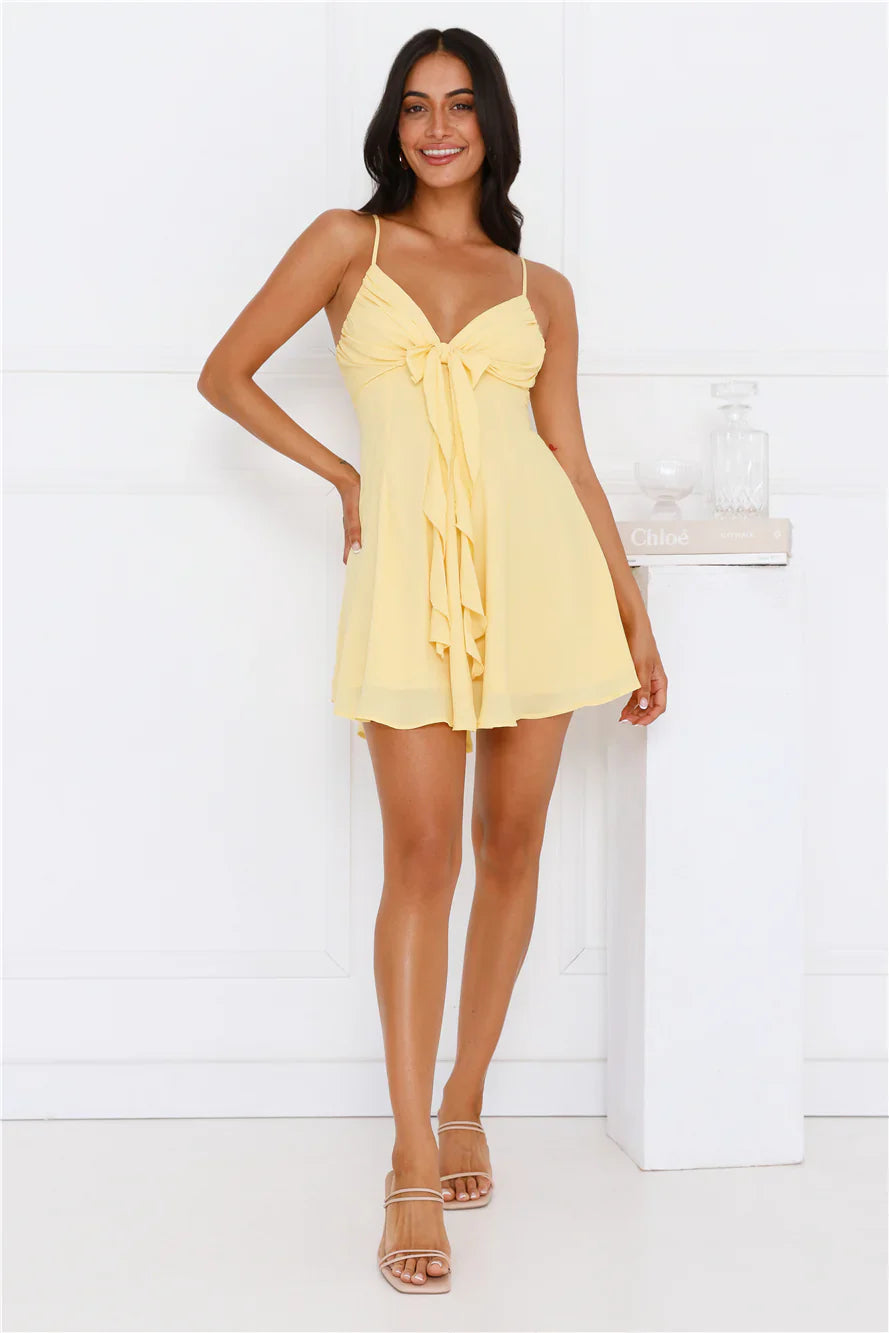 We're in love with the Smile Back At Me Mini Dress. Featuring a gorgeous bow with a frill detail and a flowy skirt. Style with heels and curls for all the attention.