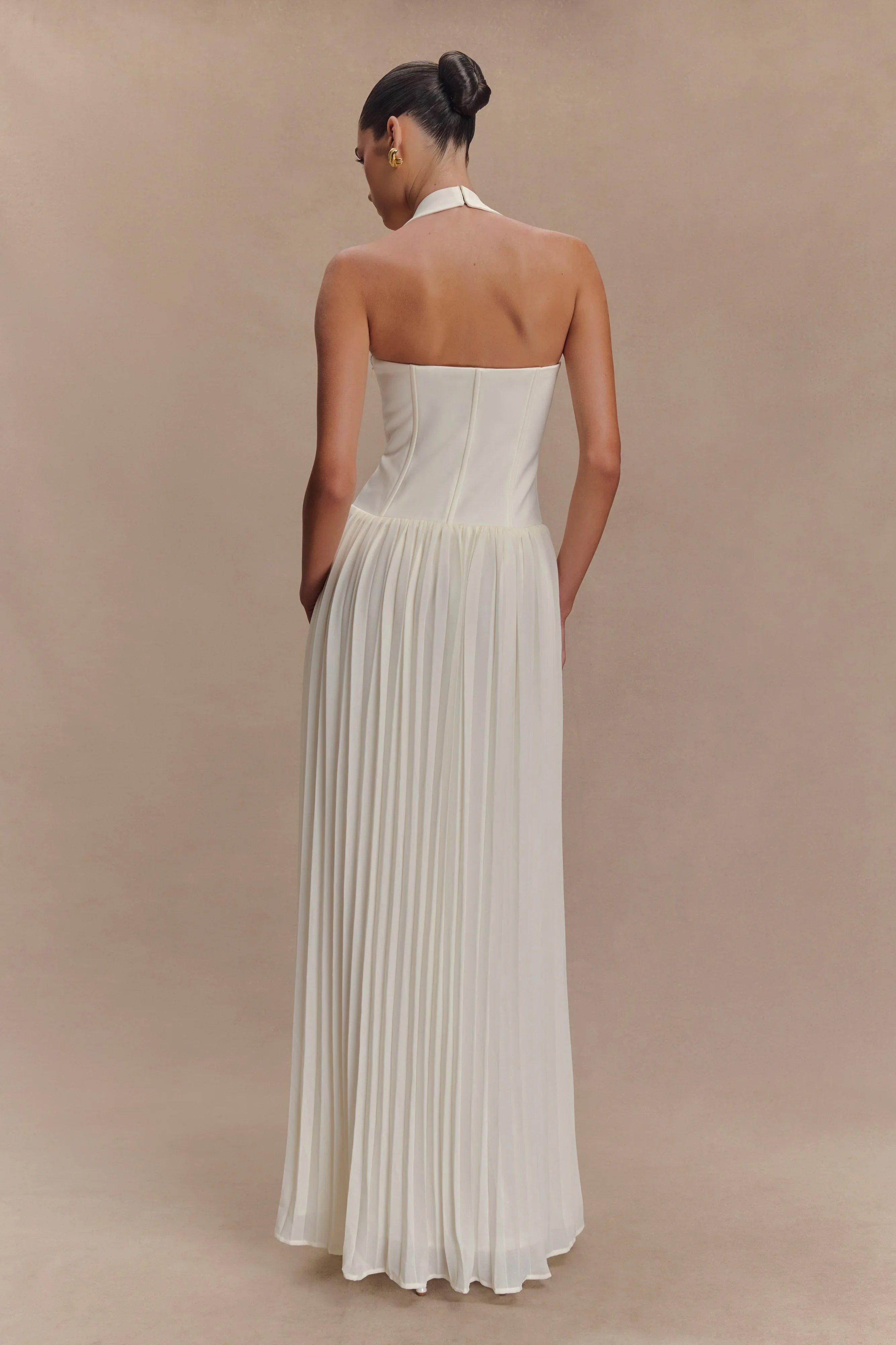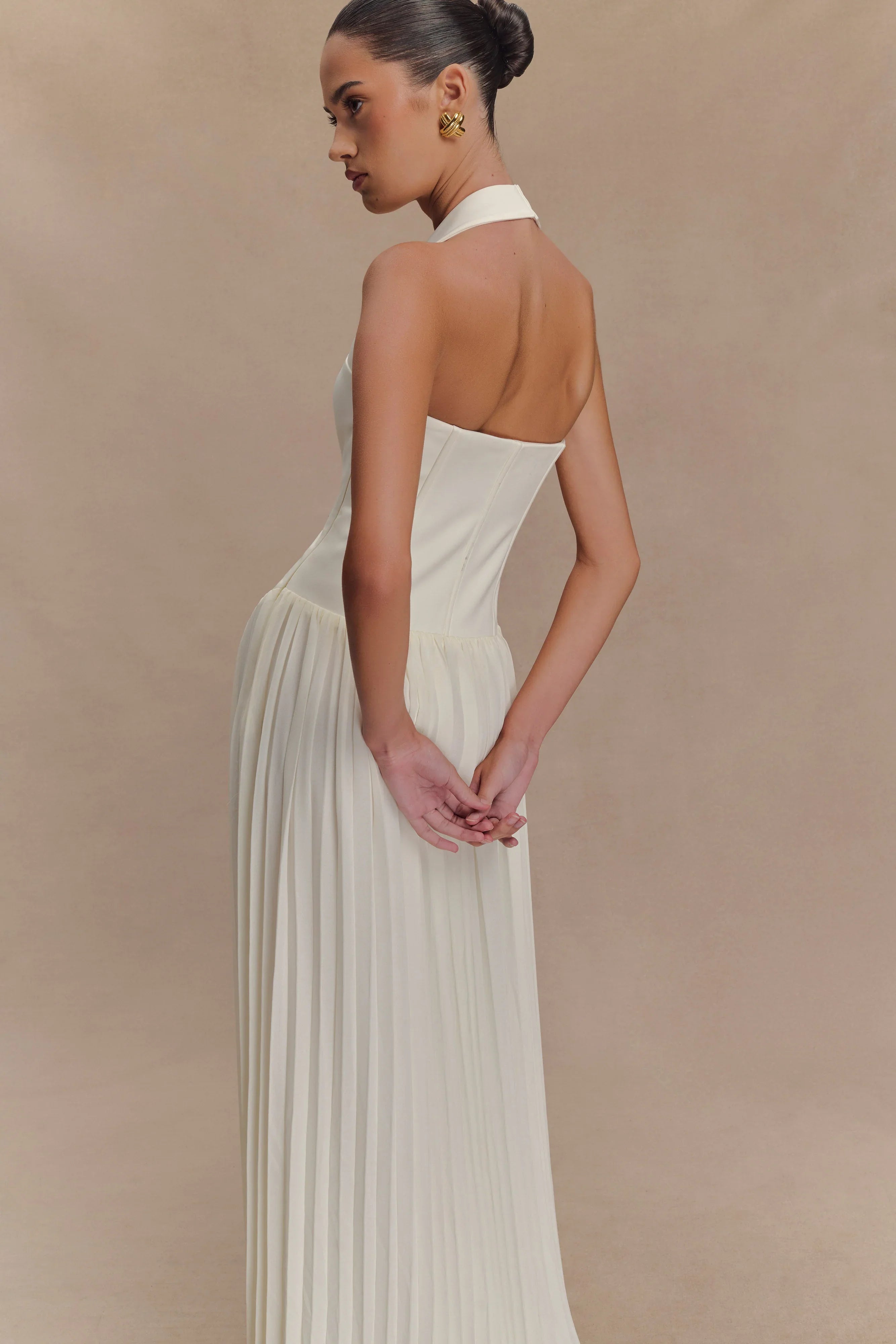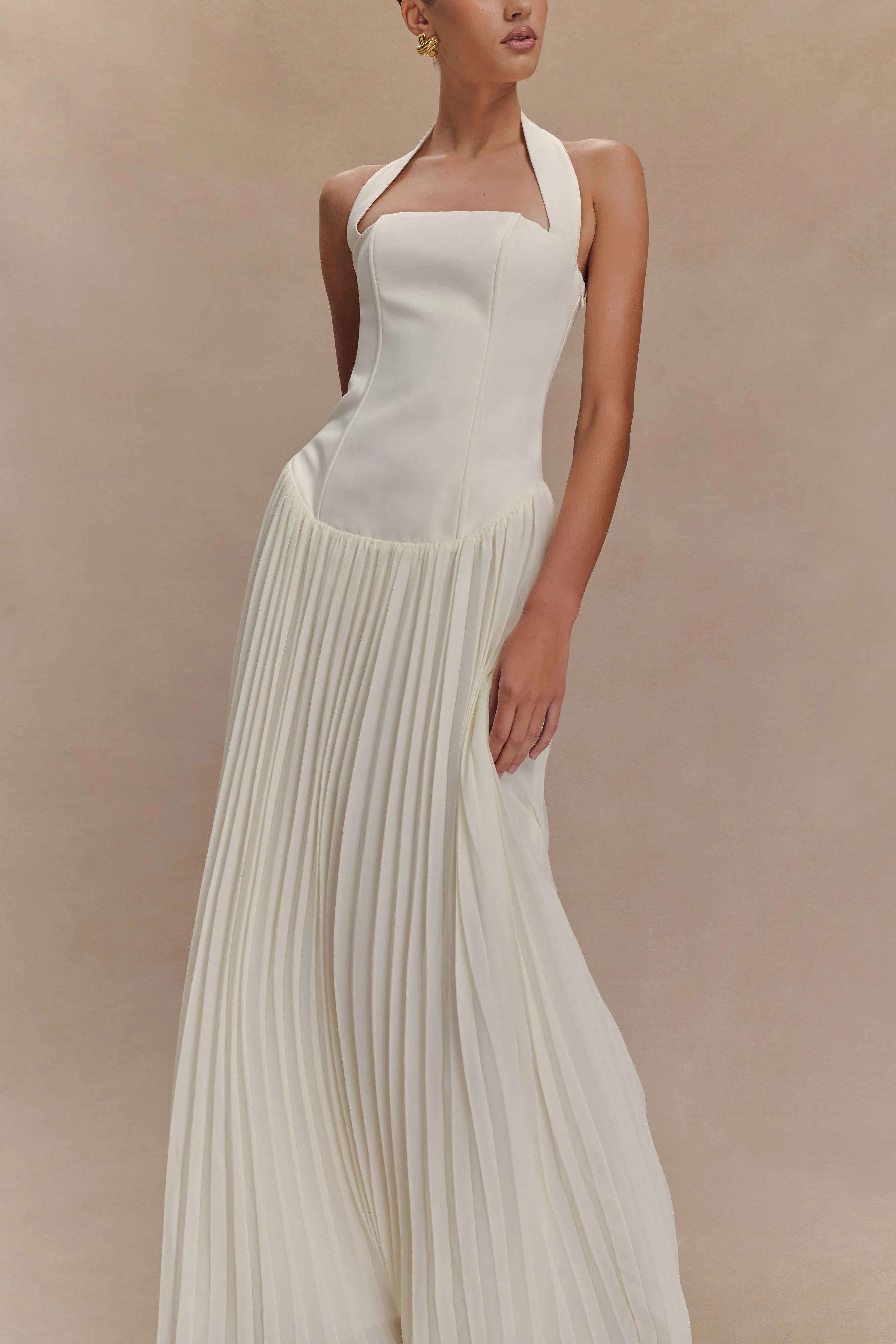 Make an unforgettable entrance in the STACIE Pleated Halter Maxi Dress, a stunning fusion of structure and fluidity. Designed with a strapless, fitted bodice and internal boning, this dress offers a sculpted silhouette that accentuates your figure. The drop waist transitions seamlessly into a flowing pleated contrast skirt, creating movement with every step. Finished with a discreet side zip for a sleek fit, the Stacie dress is the perfect choice for elegant soirées, weddings, and special occasions where effortless sophistication is key.