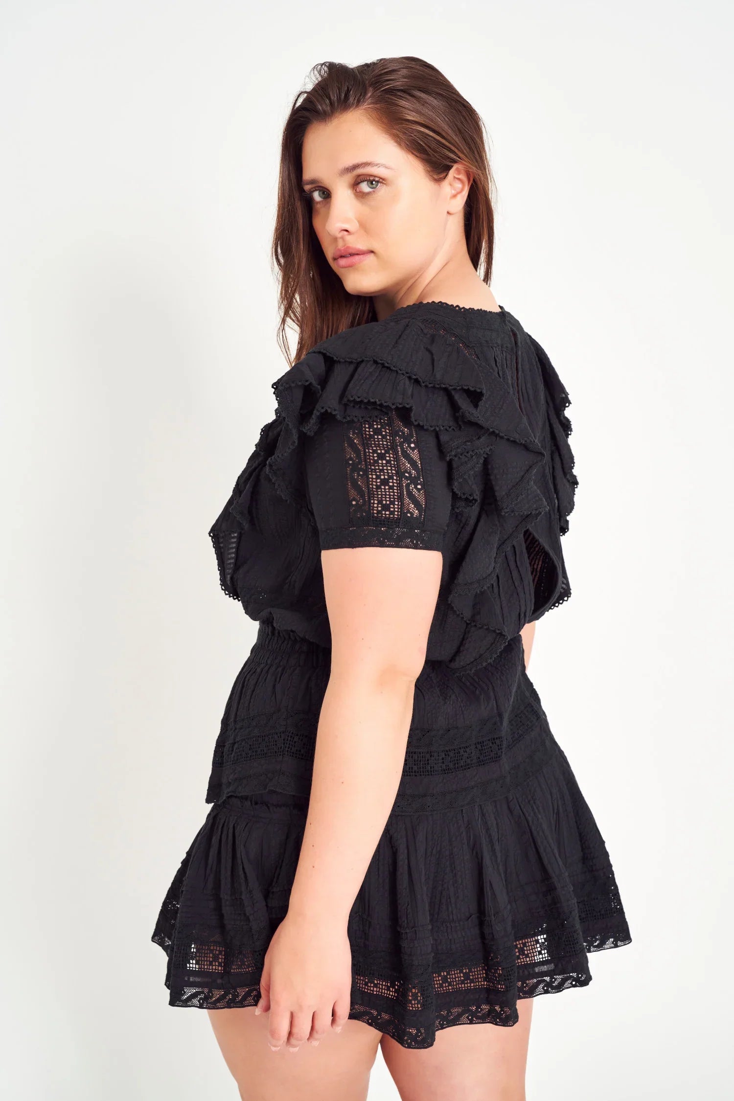 Inspired by the Moroccan medina, our desert Victorian fabric is elevated with a subtle textured stripe and little ikat print to add dimension. Custom developed lace is thoughtfully placed and inset with delicate sensibility. Our flirty Stella Dress has a short, fitted sleeve with flouncy ruffles cascading down the princess seams adding drama to the top of the shoulder. Pointed inset laces on the bodice and ruffle mini skirt call on vintage influences for a perfectly feminine look.