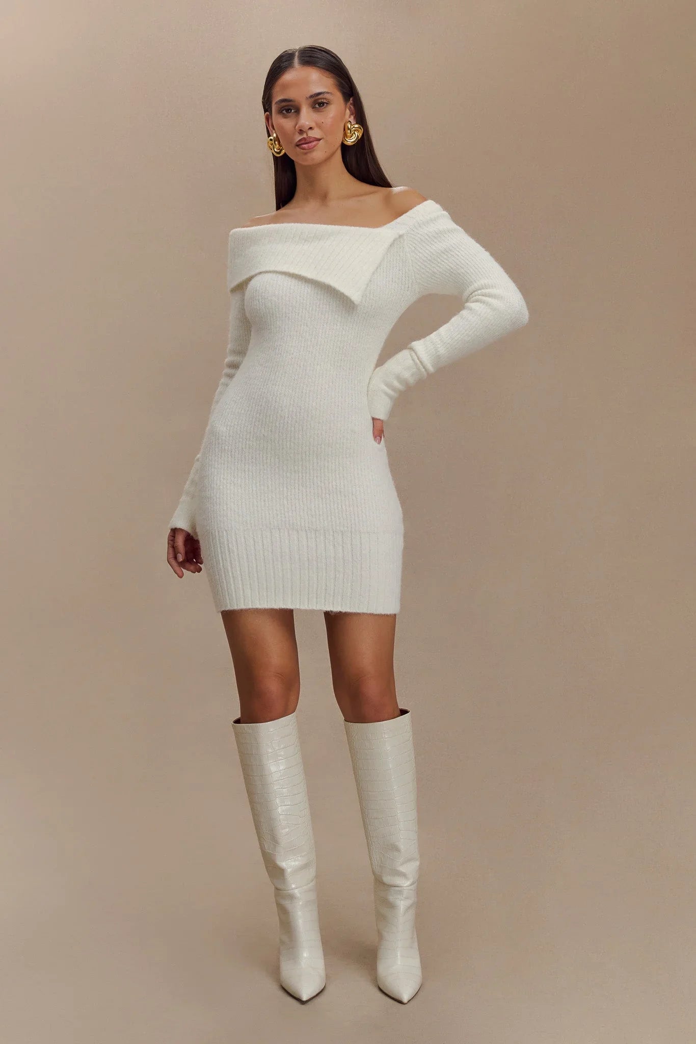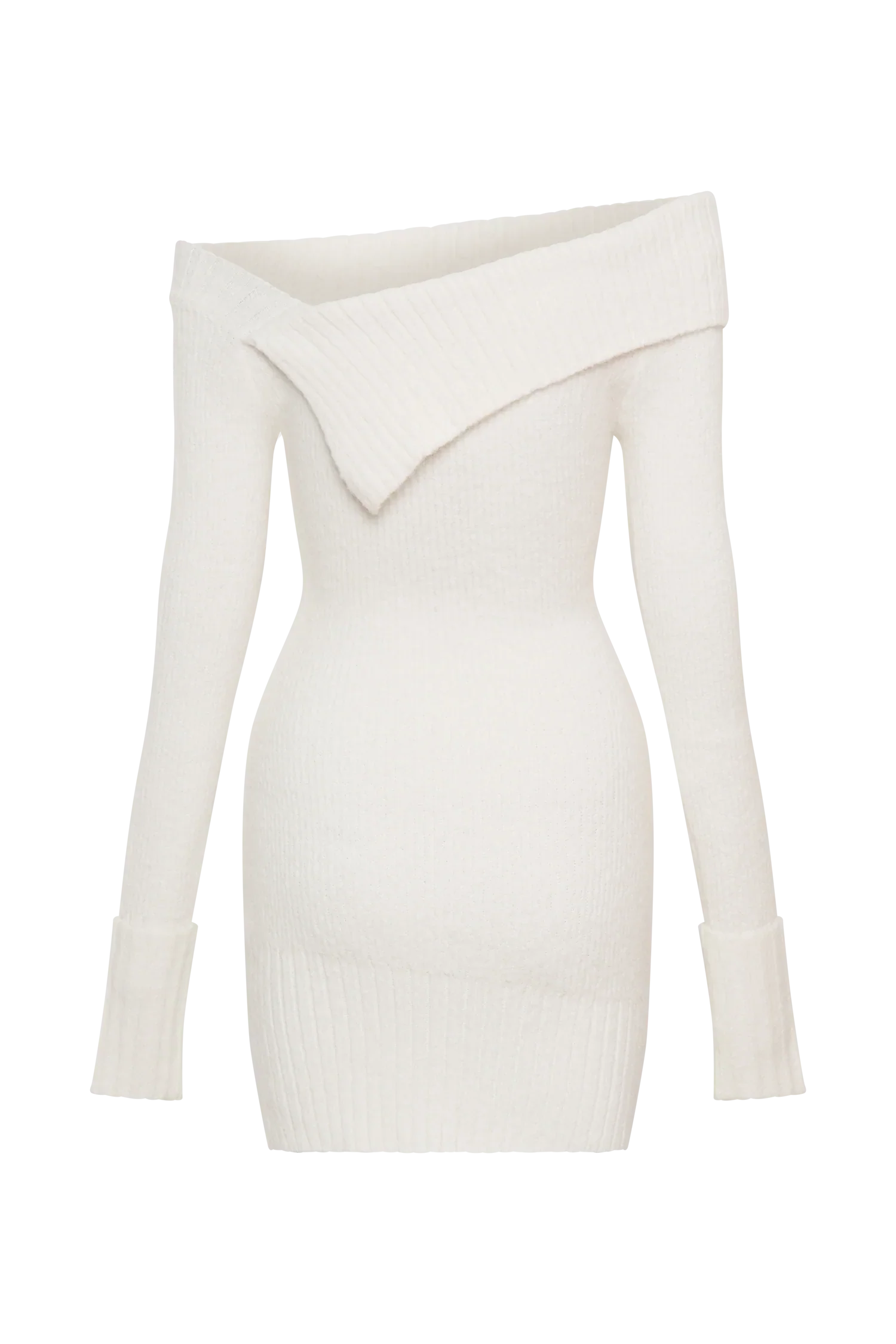 The STEPHANIE Asymmetric Knit Mini Dress offers a contemporary twist on classic design with its striking asymmetrical neckline and ribbed overlay. Featuring long sleeves and ribbed cuffs, this mini dress combines warmth with modern style. The unlined knit construction ensures a lightweight, comfortable fit that drapes beautifully. With its mini length and unique neckline detail, the Stephanie Dress is perfect for making a fashionable statement at any event, seamlessly blending comfort and edgy elegance.