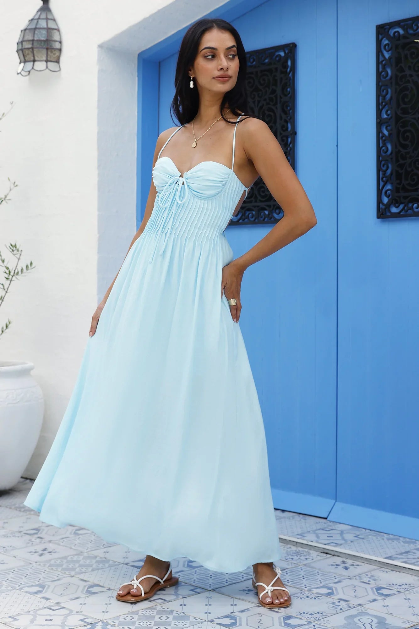 Float through sun-drenched days in our Summer Dreaming Maxi Dress in Blue. Featuring a romantic sweetheart neckline with delicate tie detail and pintuck pleating, this dress embodies effortless Mediterranean charm. The flowing silhouette in soft, breathable fabric cascades to a graceful ankle length, perfect for catching gentle summer breezes.
