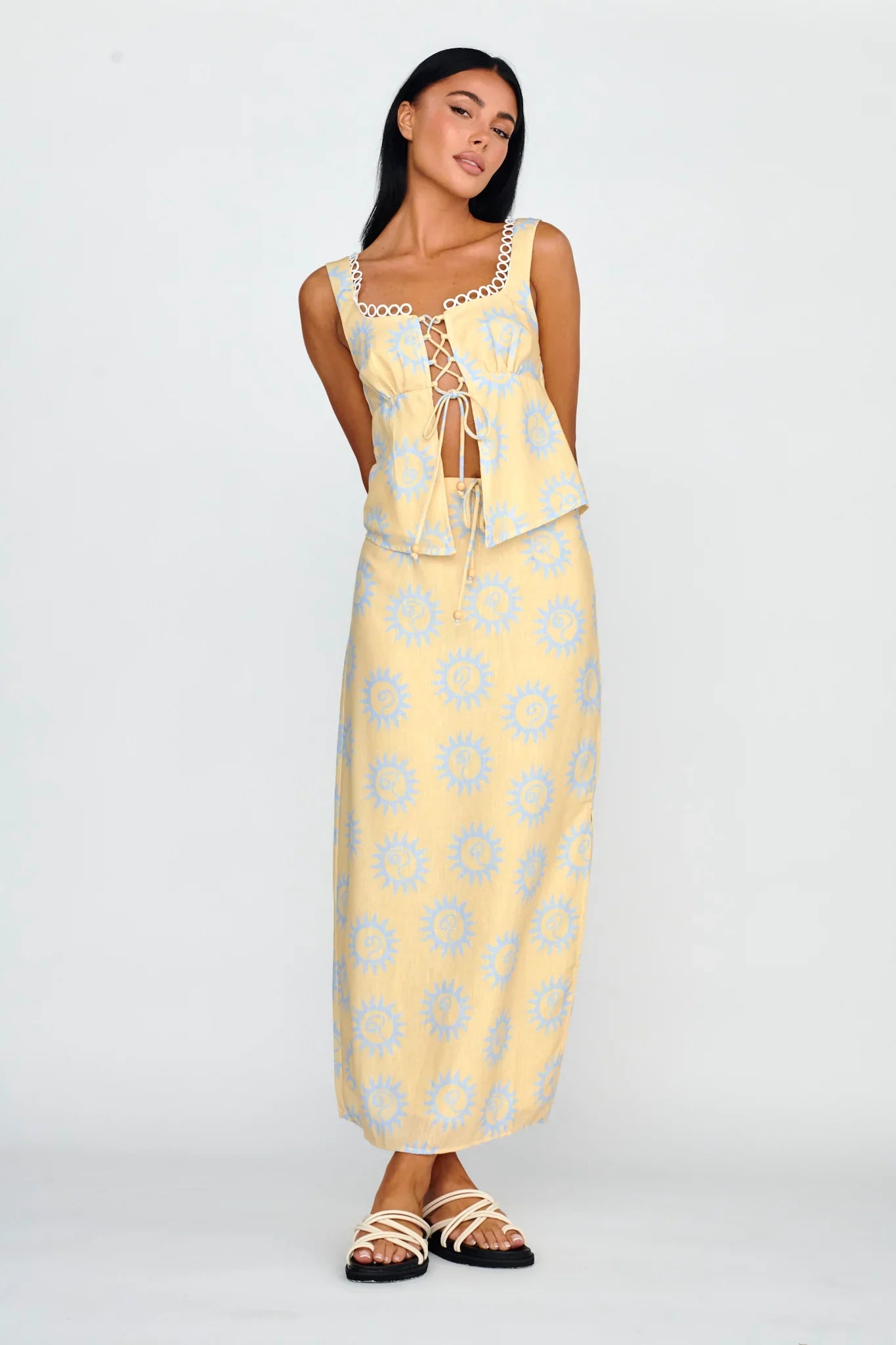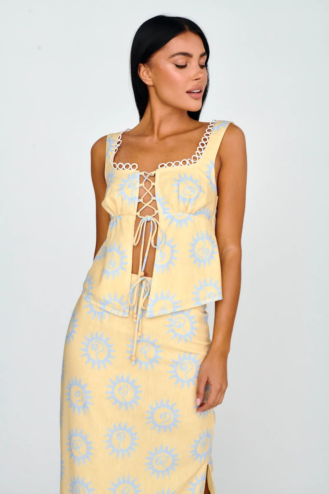 The weekend is calling and you need this top! Our Sun Days top is perfect for coffee dates with your girls or strolling the vintage markets. We are in love with the cheery sun print! Team it with its matching skirt and sandals for a chic look we are all about.