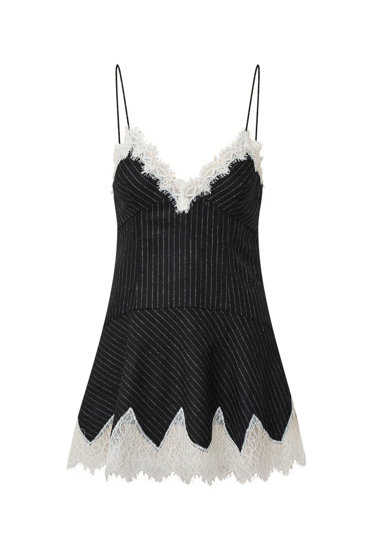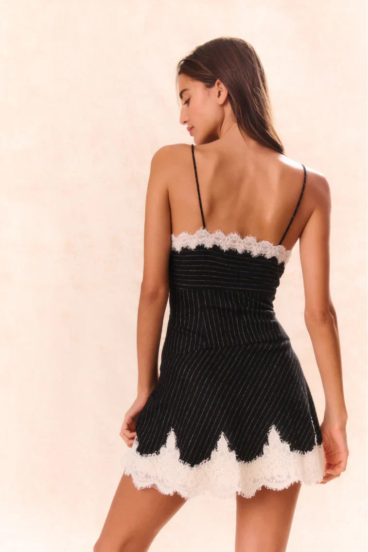Put on the pretty with the Teddi Dress. This flirty mini is part of our menswear-inspired pinstripe wolf suiting group and is all about the striking contrast between the pinstripe print and vintage-inspired laces. Feminine and flattering, the playful piece begins with spaghetti straps with a lace-adorned neckline, an empire waist, and a yoke that fits to the body that releases into an airy, A-line skirt. The hem stuns with sweeping scalloped lace to finish the beautiful piece. A side zipper is included for functionality. Pair it with our Icarus Jacket to complete the look.