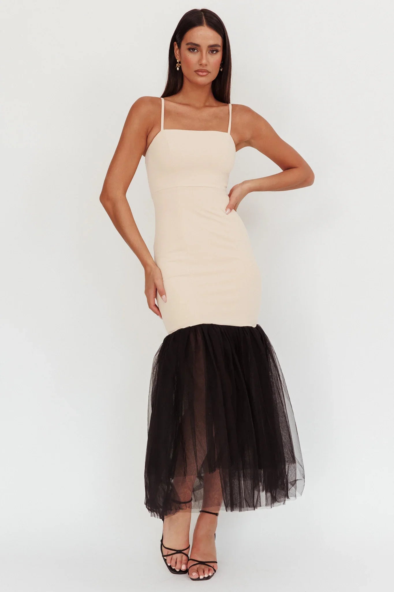 Make an entrance in our gorgeous Tomie maxi dress. We are in love with its mermaid silhouette and tufted tulle hem! It's perfect for a wedding or special event. Team it with strappy, black heels and a purse for a head-turning look.