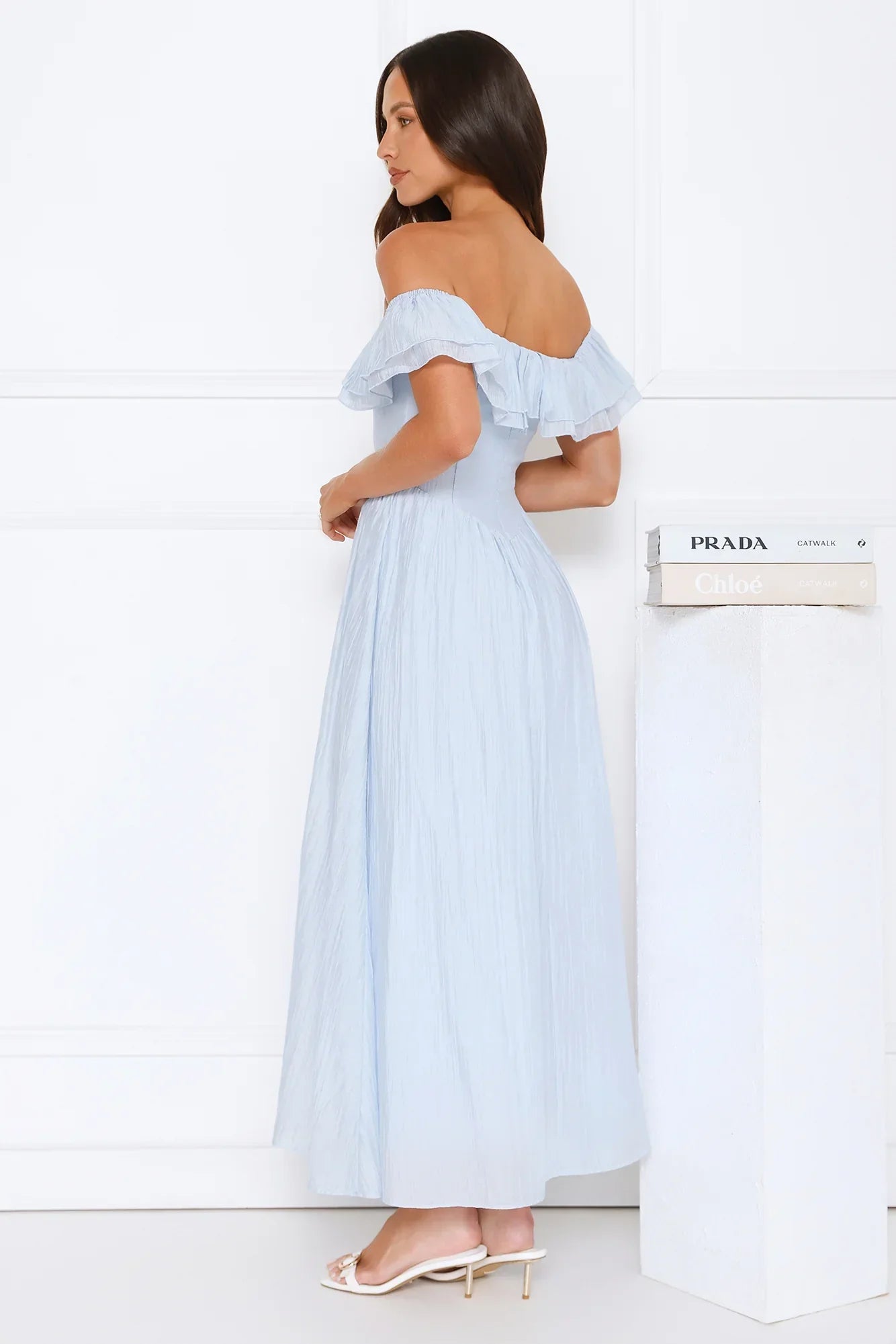 Soft ruffles and romantic sleeves come together in the Twilight Sonata Off Shoulder Maxi Dress. Crafted from a viscose-blend fabric, this off-shoulder silhouette flatters with its structured bodice and flowing skirt. Style with dainty heels, tousled waves, and a glass of something sparkling.