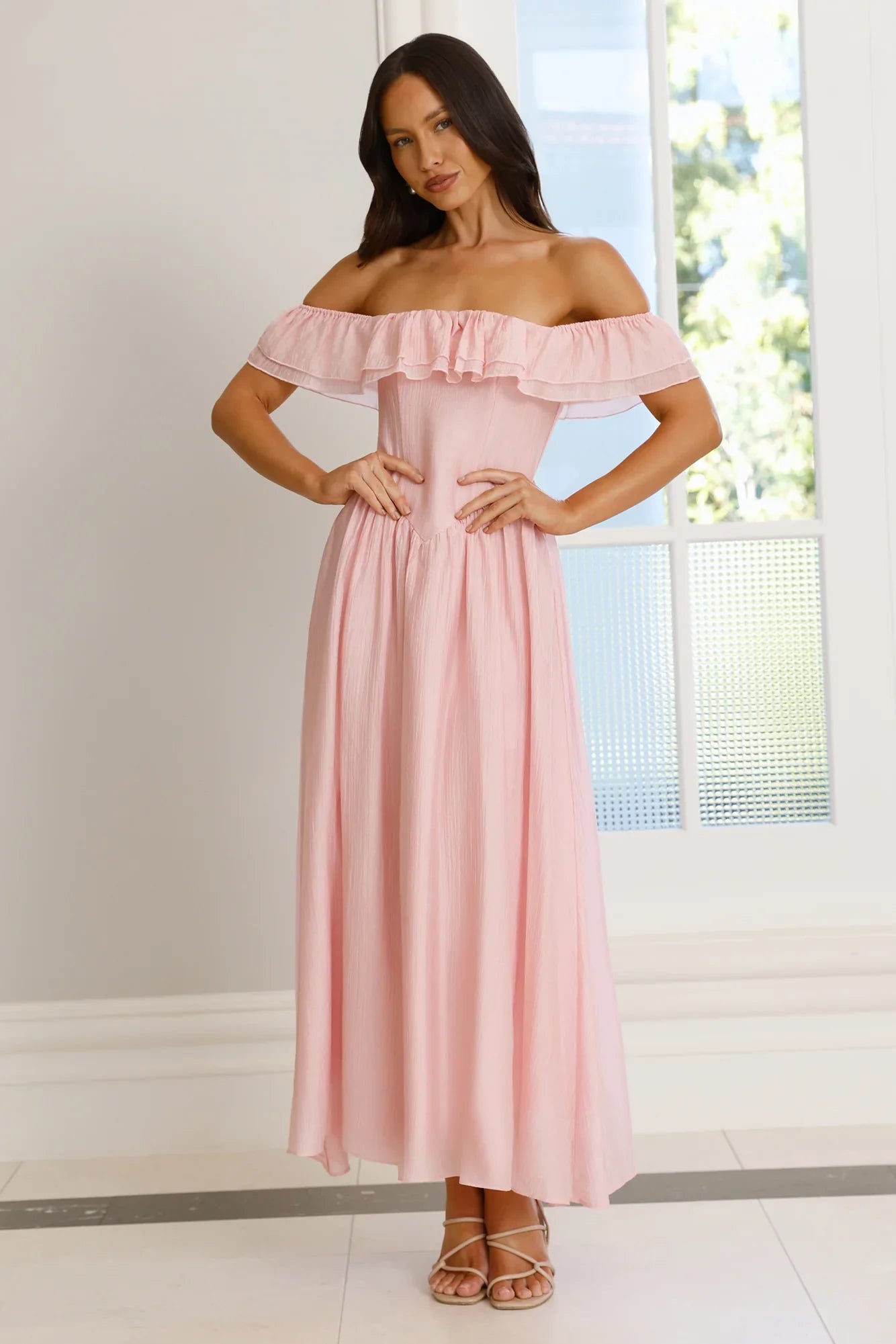 Soft ruffles and romantic sleeves come together in the Twilight Sonata Off Shoulder Maxi Dress. Crafted from a viscose-blend fabric, this off-shoulder silhouette flatters with its structured bodice and flowing skirt. Style with dainty heels, tousled waves, and a glass of something sparkling.